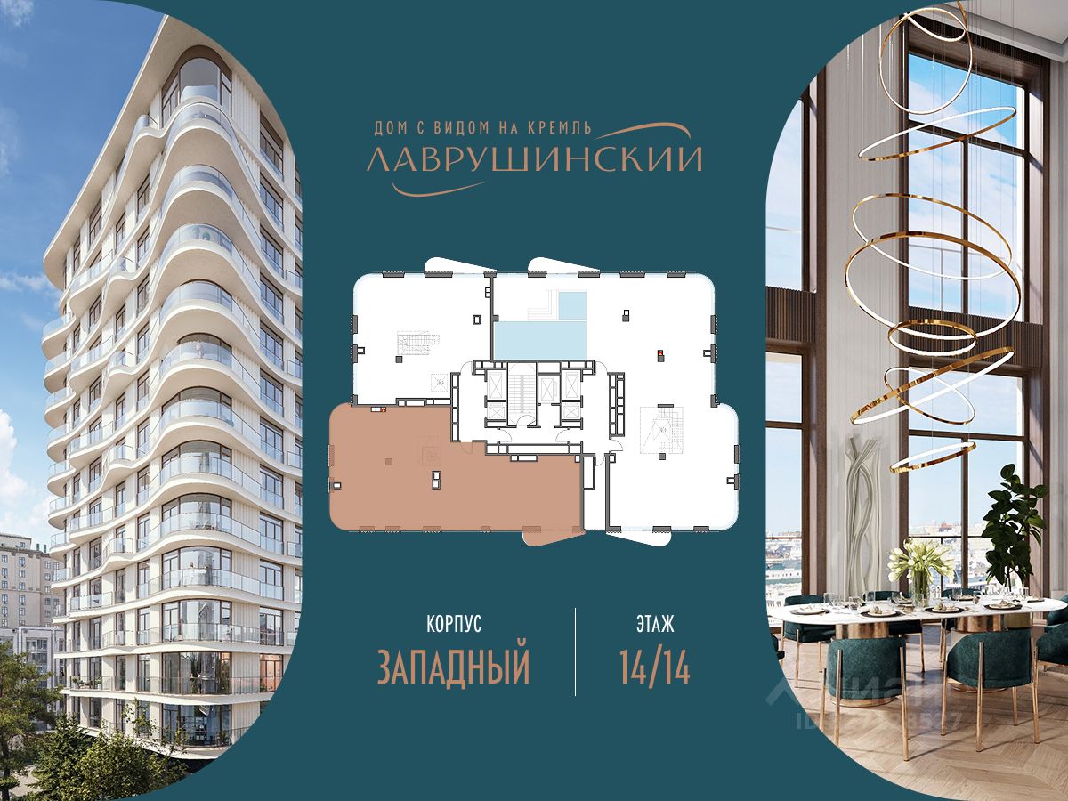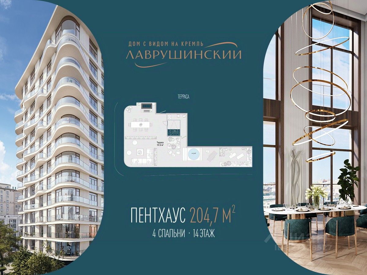 Роскошный пентхаус площадью 205 м² на 14 этаже западного корпуса дома ''Лаврушинский'', расположенного в одном километре от Кремля, в глубине собственного двора-парка площадью 1,4 гектара.