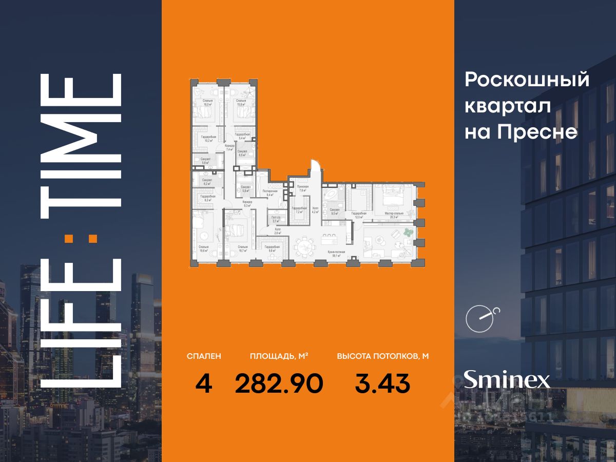 Life Time - роскошный современный квартал на Пресне, в наиболее быстро растущем премиальном районе ЦАО. Его насыщенная инфраструктура и выгодное расположение дарят время для жизни. Вы больше не тратите его на дорогу или ожидание, при этом ни в чём себе не отказывая. На территории предусмотрено всё для комфортной жизни: • двор-парк площадью 1,8 гектара с прудом и фонтанами, • Clubhouse - инфраструктурный центр в отдельном здании с исчерпывающими возможностями для спорта, отдыха и досуга только для жителей, • спортивная инфраструктура на улице и в помещении, в том числе бассейн длиной 25 метров, хот-таб, хаммам, сауна, бьюти-зона, • клубная гостиная с террасой, • всё для развития и досуга детей любого возраста, в том числе детский сад и школа. Life Time находится в центре сложившегося премиального района, в окружении многочисленных парков. Удобная транспортная доступность и прямой выезд на Звенигородское шоссе позволяют без проблем добраться до Садового кольца и Москва-Сити. Архитектурный стиль квартала - роскошный минимализм. Дома десятилетиями будут выглядеть современно. В Life Time представлен широкий выбор как квартир, так и особых форматов: двухэтажные пентхаусы с каминами и террасами, скай-виллы.