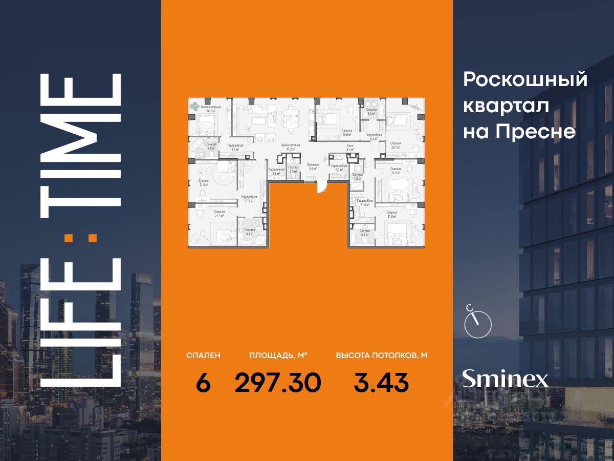 Life Time - роскошный современный квартал на Пресне, в наиболее быстро растущем премиальном районе ЦАО. Его насыщенная инфраструктура и выгодное расположение дарят время для жизни. Вы больше не тратите его на дорогу или ожидание, при этом ни в чём себе не отказывая. На территории предусмотрено всё для комфортной жизни: • двор-парк площадью 1,8 гектара с прудом и фонтанами, • Clubhouse - инфраструктурный центр в отдельном здании с исчерпывающими возможностями для спорта, отдыха и досуга только для жителей, • спортивная инфраструктура на улице и в помещении, в том числе бассейн длиной 25 метров, хот-таб, хаммам, сауна, бьюти-зона, • клубная гостиная с террасой, • всё для развития и досуга детей любого возраста, в том числе детский сад и школа. Life Time находится в центре сложившегося премиального района, в окружении многочисленных парков. Удобная транспортная доступность и прямой выезд на Звенигородское шоссе позволяют без проблем добраться до Садового кольца и Москва-Сити. Архитектурный стиль квартала - роскошный минимализм. Дома десятилетиями будут выглядеть современно.