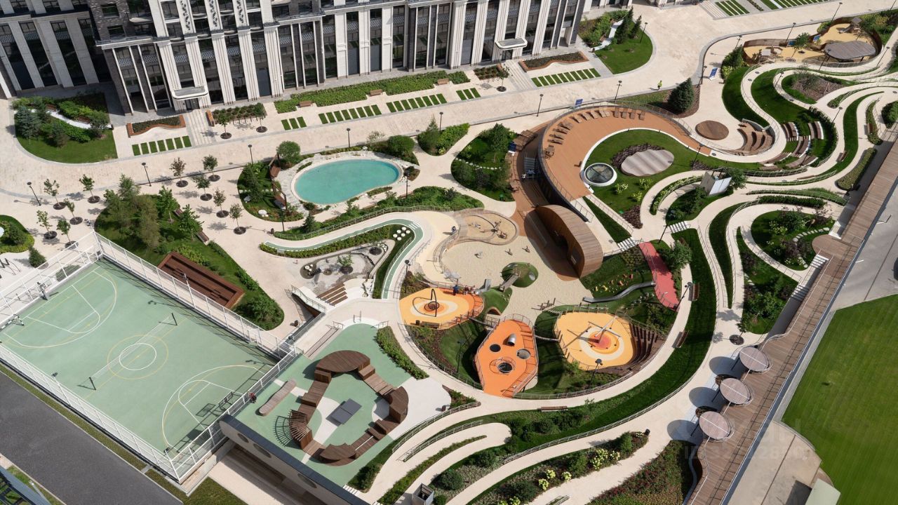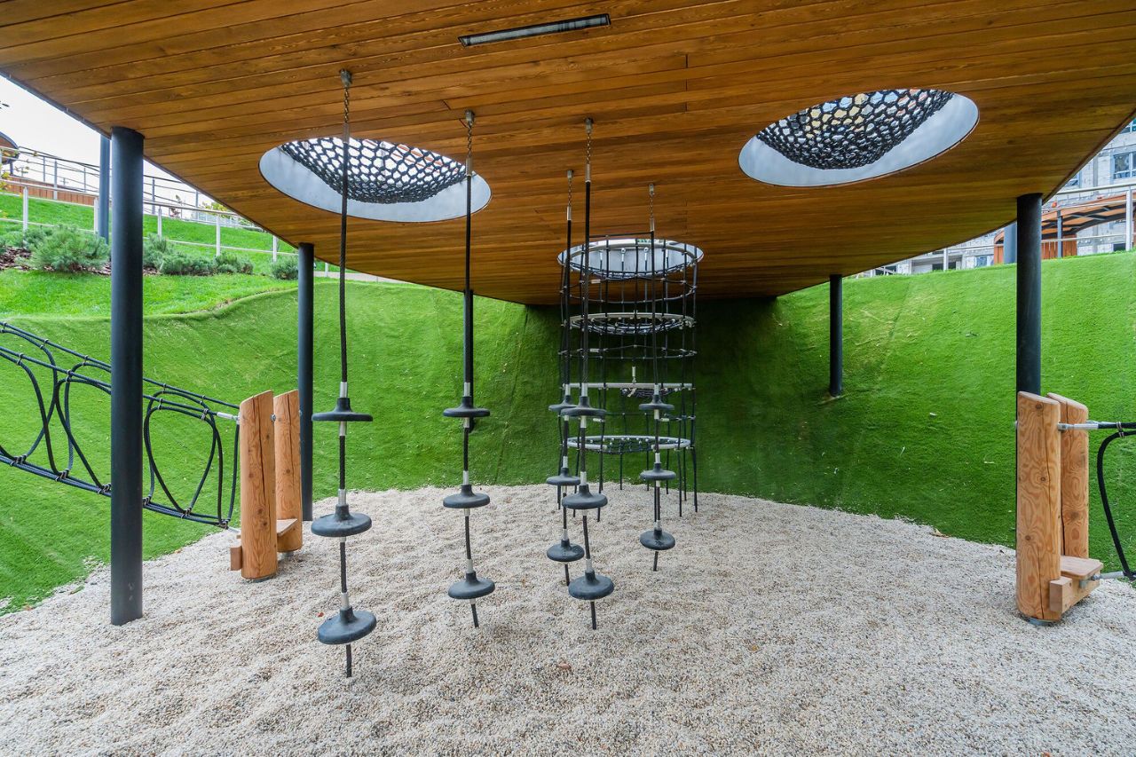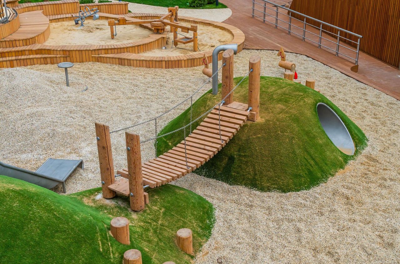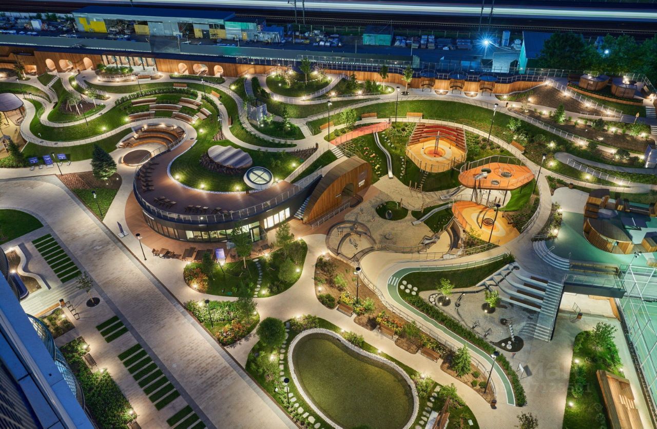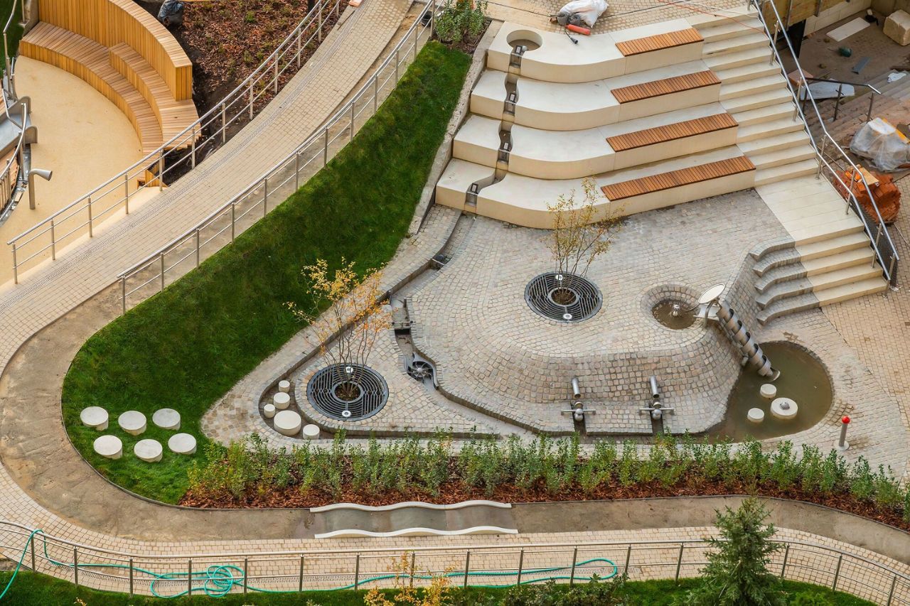 В центральной части парка расположен амфитеатр со сценой для представлений и проведения мероприятий. Для гармоничного развития маленьких жителей - пространства по стандарту Kid's Lab для гармоничного развития детей всех возрастов: детская площадка, игровая комната, рельефная площадка для общения со сверстниками, где можно заниматься паркуром, танцевать и играть в настольный теннис.