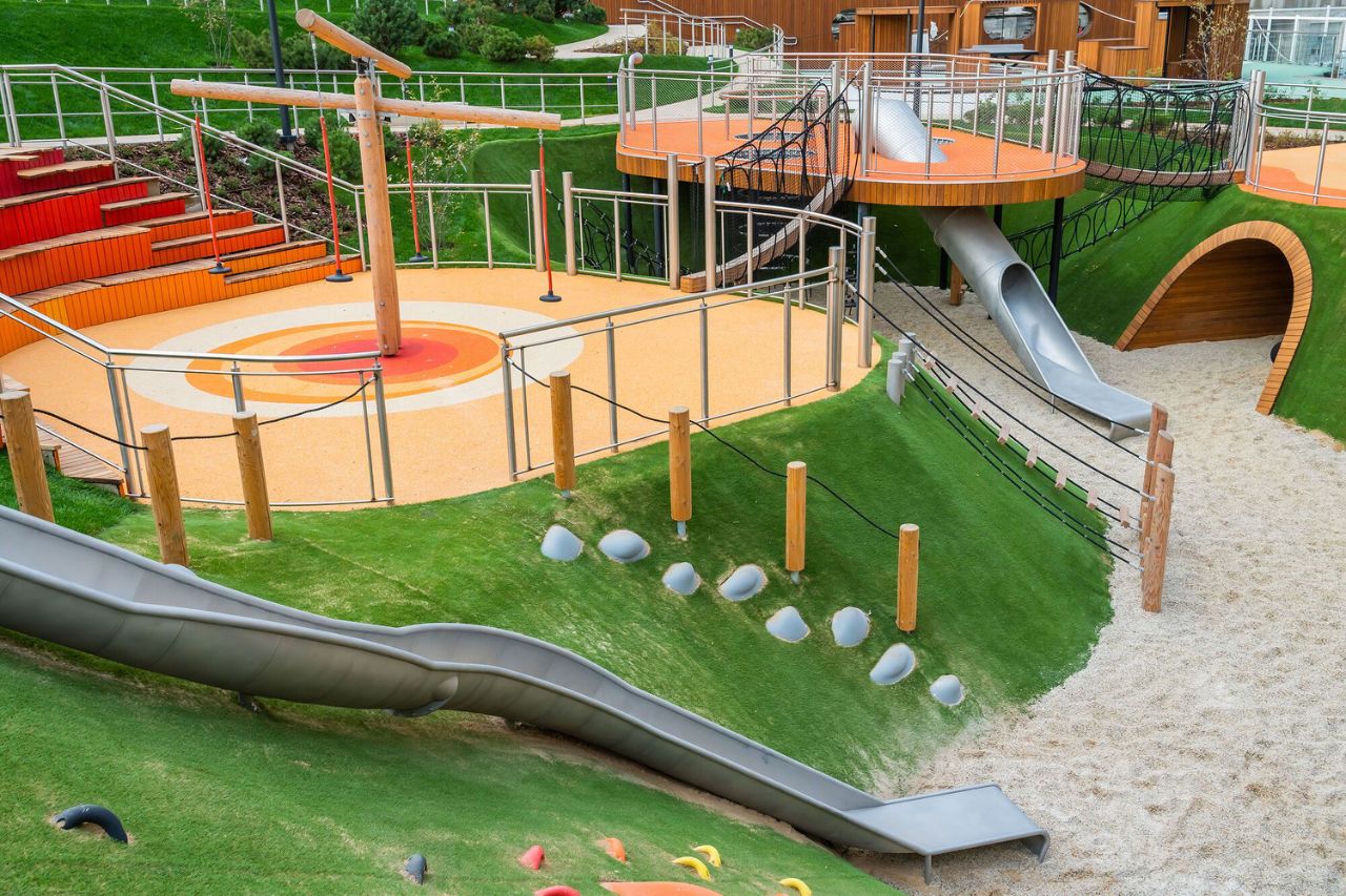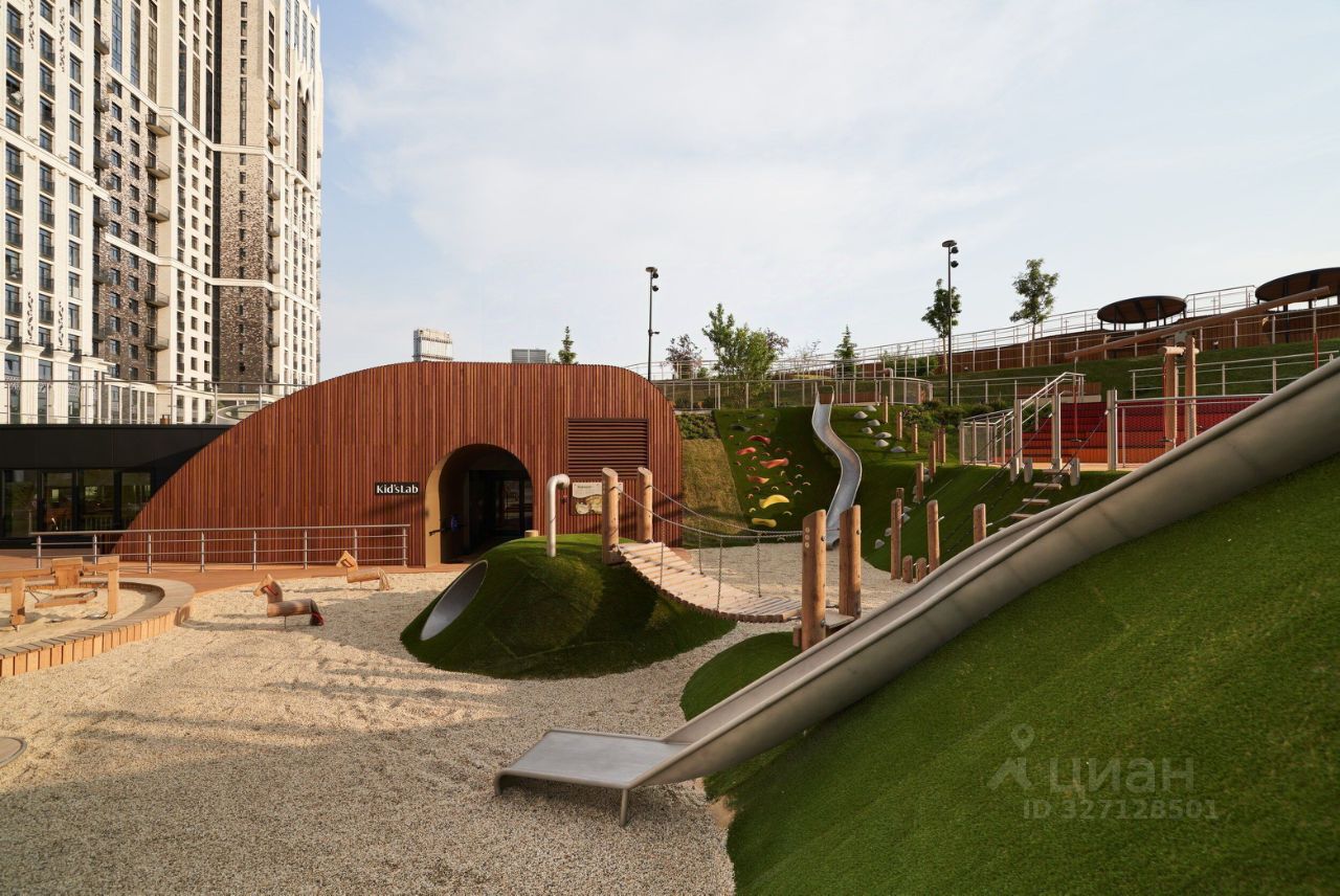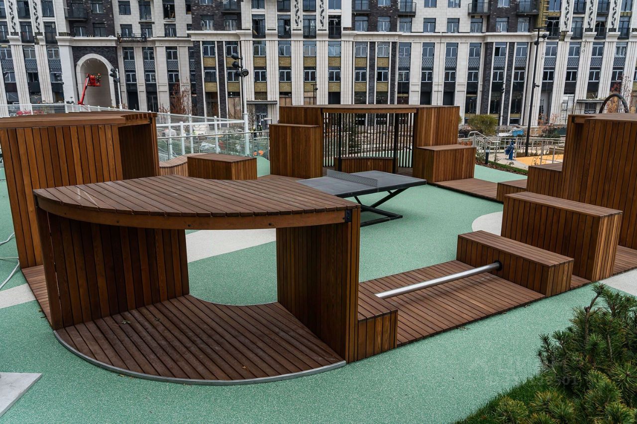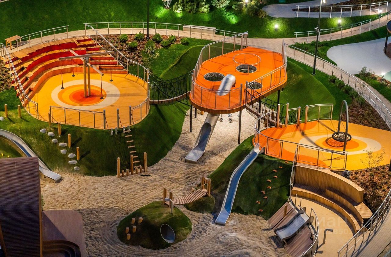 В центральной части парка расположен амфитеатр со сценой для представлений и проведения мероприятий. Для гармоничного развития маленьких жителей - пространства по стандарту Kid's Lab для гармоничного развития детей всех возрастов: детская площадка, игровая комната, рельефная площадка для общения со сверстниками, где можно заниматься паркуром, танцевать и играть в настольный теннис.