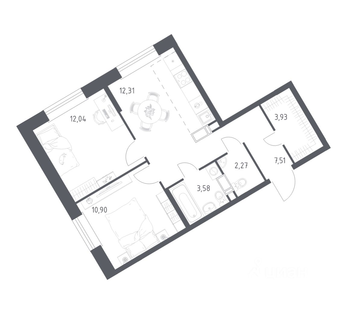 Общая площадь52,54 м2