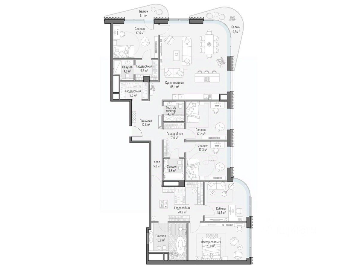 В проекте уникальный выбор квартир с просторными балконами, пентхаусов с террасами, бассейнами и каминами, максимальными видовыми характеристиками, а также роскошных вилл. Всего - 153 квартиры и 101 продуманное планировочное решение. Высота потолков составляет от 3,5 до 8,25 м. В доме предусмотрен 2х-уровневый паркинг на 279 машино-места.