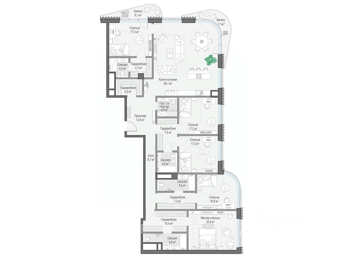 В проекте уникальный выбор квартир с просторными балконами, пентхаусов с террасами, бассейнами и каминами, максимальными видовыми характеристиками, а также роскошных вилл. Всего - 153 квартиры и 101 продуманное планировочное решение. Высота потолков составляет от 3,5 до 8,25 м. В доме предусмотрен 2х-уровневый паркинг на 279 машино-места.