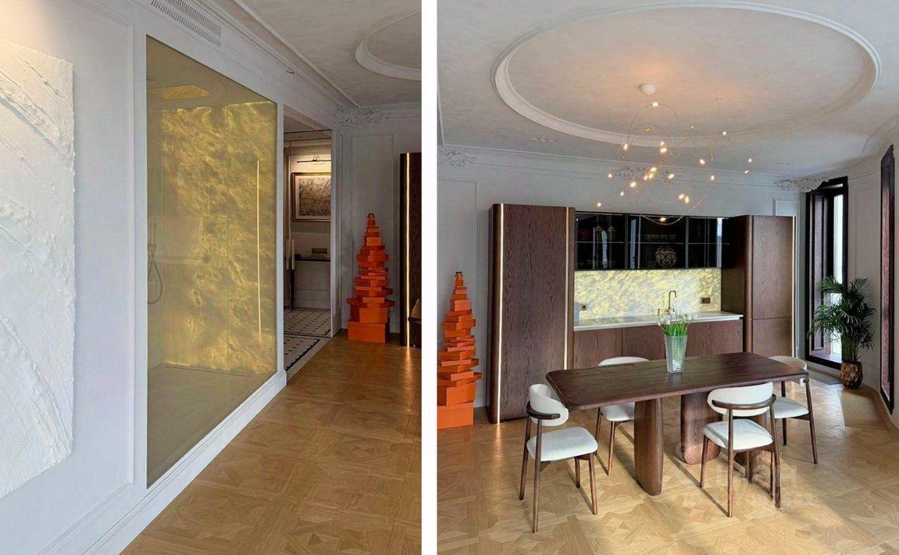 В гостиной расположен мраморный каминный портал, дизайнерская мебель и художественные элементы, формирующие цельную архитектурную композицию. Спальня выполнена в более приватной и спокойной эстетике, с интегрированной гардеробной и продуманными системами хранения. Ванная комната облицована натуральным мрамором и оборудована современной сантехникой премиального уровня.