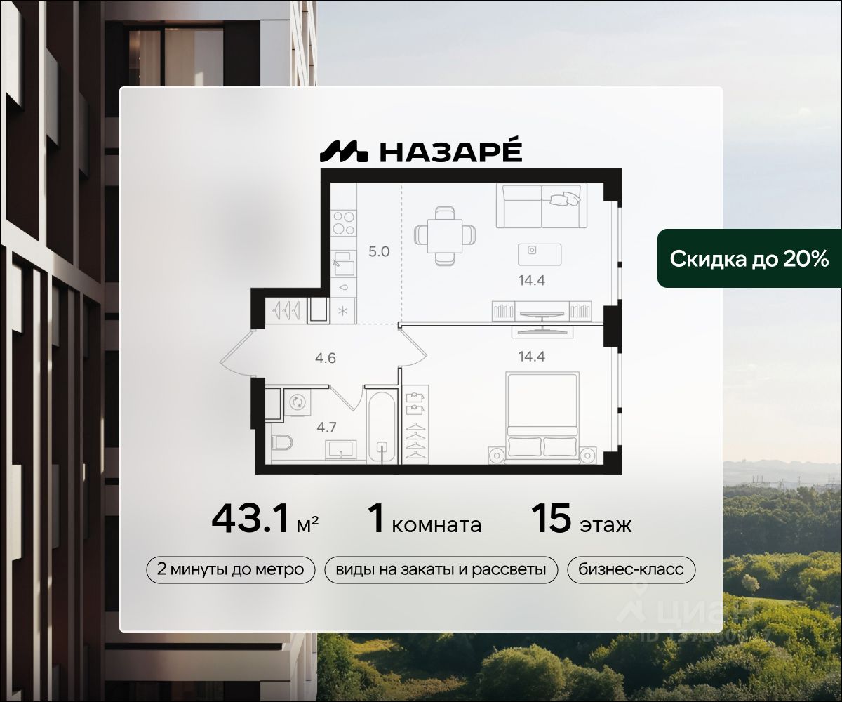 Просторная 1-комнатная квартира для молодой семьи. Общая площадь - 43.1м2, удобная планировка, кухня-гостиная 19.4м2. Панорамные виды из окон на две стороны - на национальный парк ''Лосиный остров'' и благоустроенный внутренний двор. Условия покупки: - Скидка при полной оплате - 10% - Ипотека от 3,5% на весь срок или 0,11% на первый год - Рассрочка без процентов - Trade-in с проживанием на время строительства дома НАЗАРЕ - шесть домов бизнес-класса высотой 24-43 этажа. Проект расположен рядом с национальным парком ''Лосиный остров'' и парком ''Сокольники''. В продаже квартиры с мастер-спальнями, кухнями-гостиными, открытыми террасами, просторными кладовыми и ванными с окном. Форматы - от светлых студий 21,6 м2 до семейных 4-комнатных 125,5 м2.