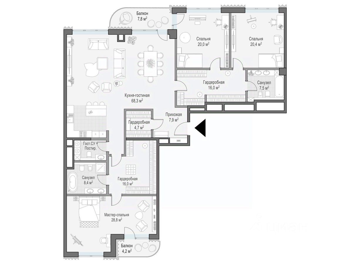 В проекте уникальный выбор квартир с просторными балконами, пентхаусов с террасами, бассейнами и каминами, максимальными видовыми характеристиками, а также роскошных вилл. Всего - 153 квартиры и 101 продуманное планировочное решение. Высота потолков составляет от 3,5 до 8,25 м. В доме предусмотрен 2х-уровневый паркинг на 279 машино-места.