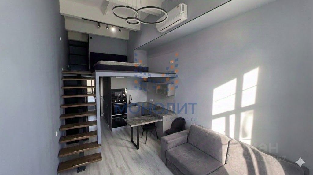 Планировка с антресолью позволяет комфортно зонировать пространство: спальная зона расположена наверху, внизу — гостиная. Высота потолков 4.5 метра создает ощущение простора. Большие окна выходят во двор.