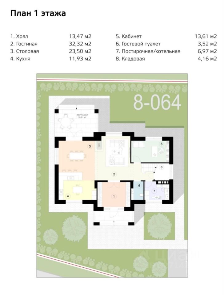 Характеристики: Двухэтажный коттедж общей площади 276,4 м2 включая 3 террасы и балкон. В доме предусмотрено: Первый этаж: холл, гостинная, кухня-столовая с выходом на террасу, кабинет или гостевая спальня, гостевой санузел, кладовая или гардеробная, котельная/постирочная.