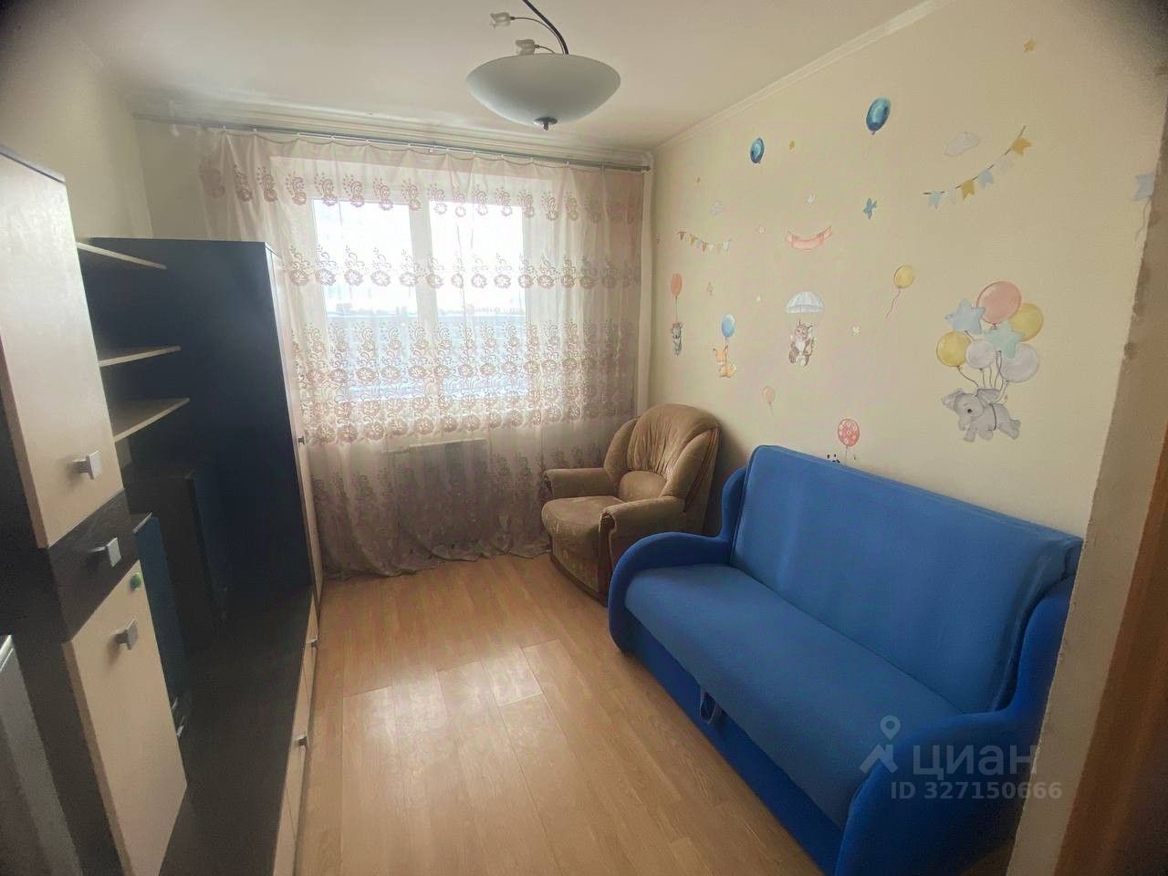 Спальня/детская (меньшая комната): Универсальное помещение. Оснащено диваном, шкафом, стеллажом — можно использовать как для ребенка, так и для взрослого.