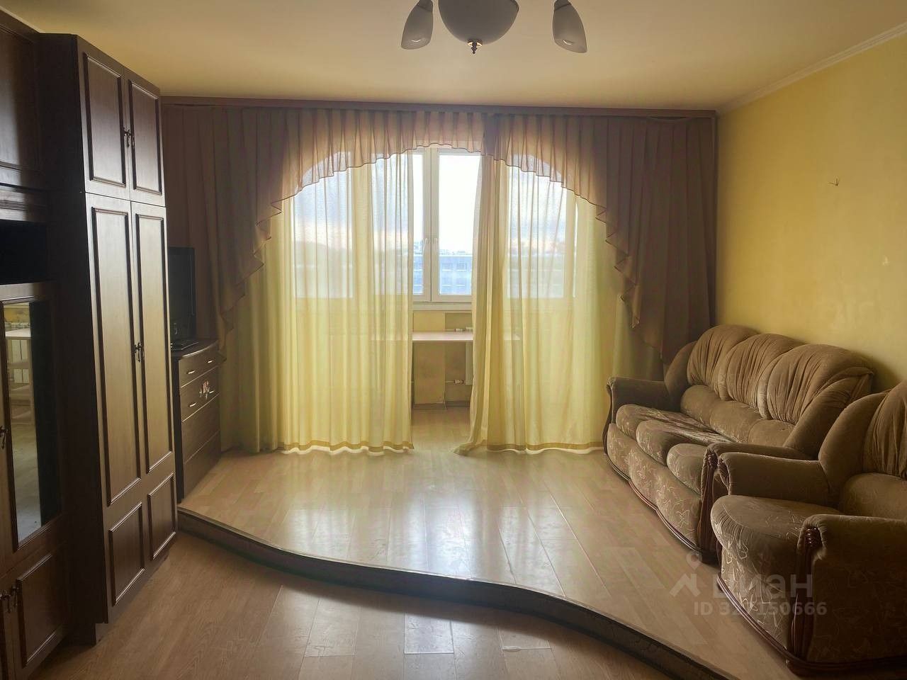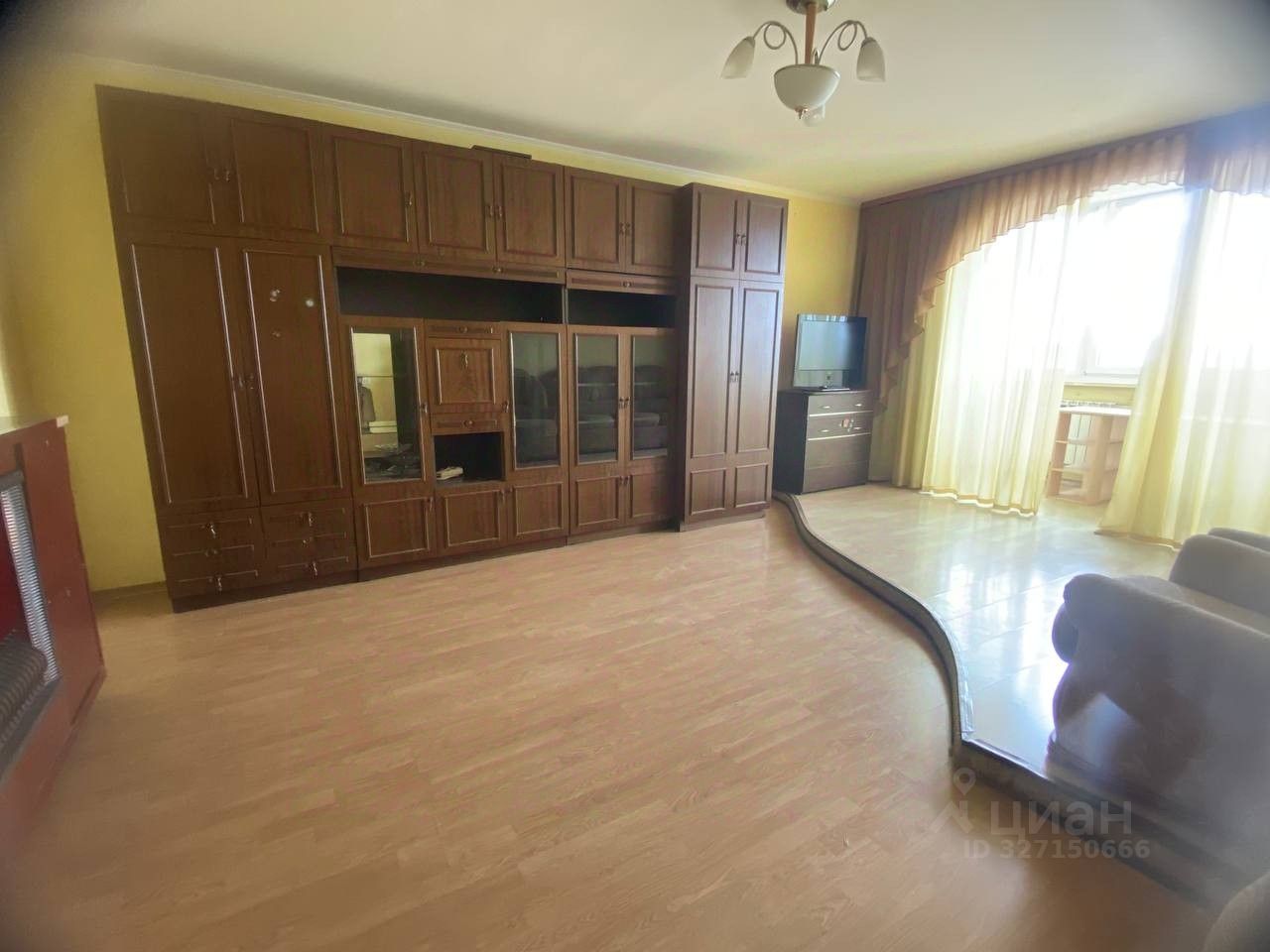 Гостиная (большая комната): Просторное помещение, подойдет для отдыха и приема гостей. Есть мягкая мебель диван и кресло, телевизор, вместительный шкаф. Отдельно выделено помещение по типу балкона с большими окнами.