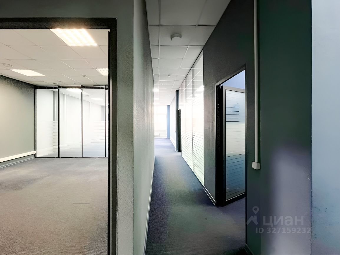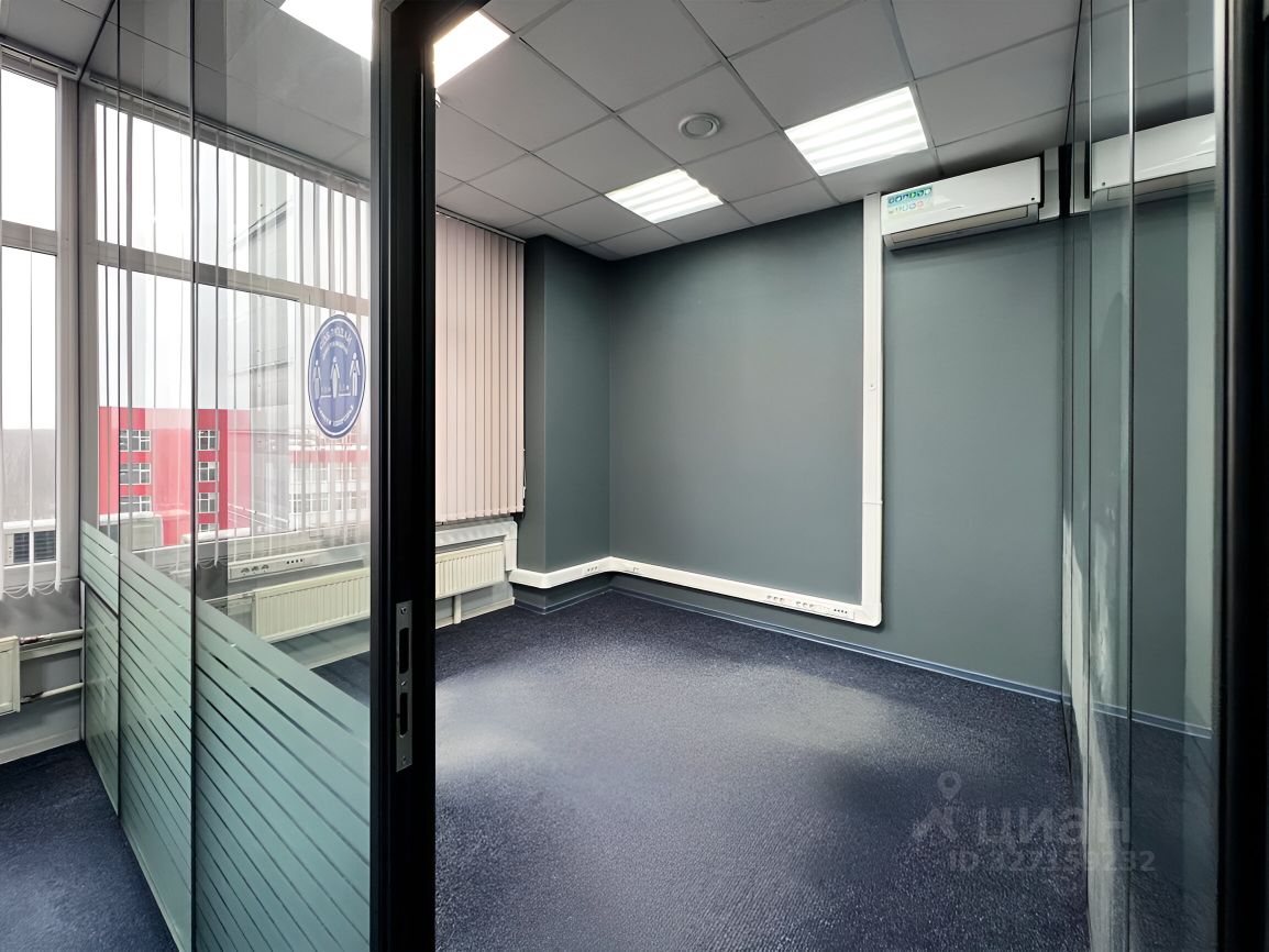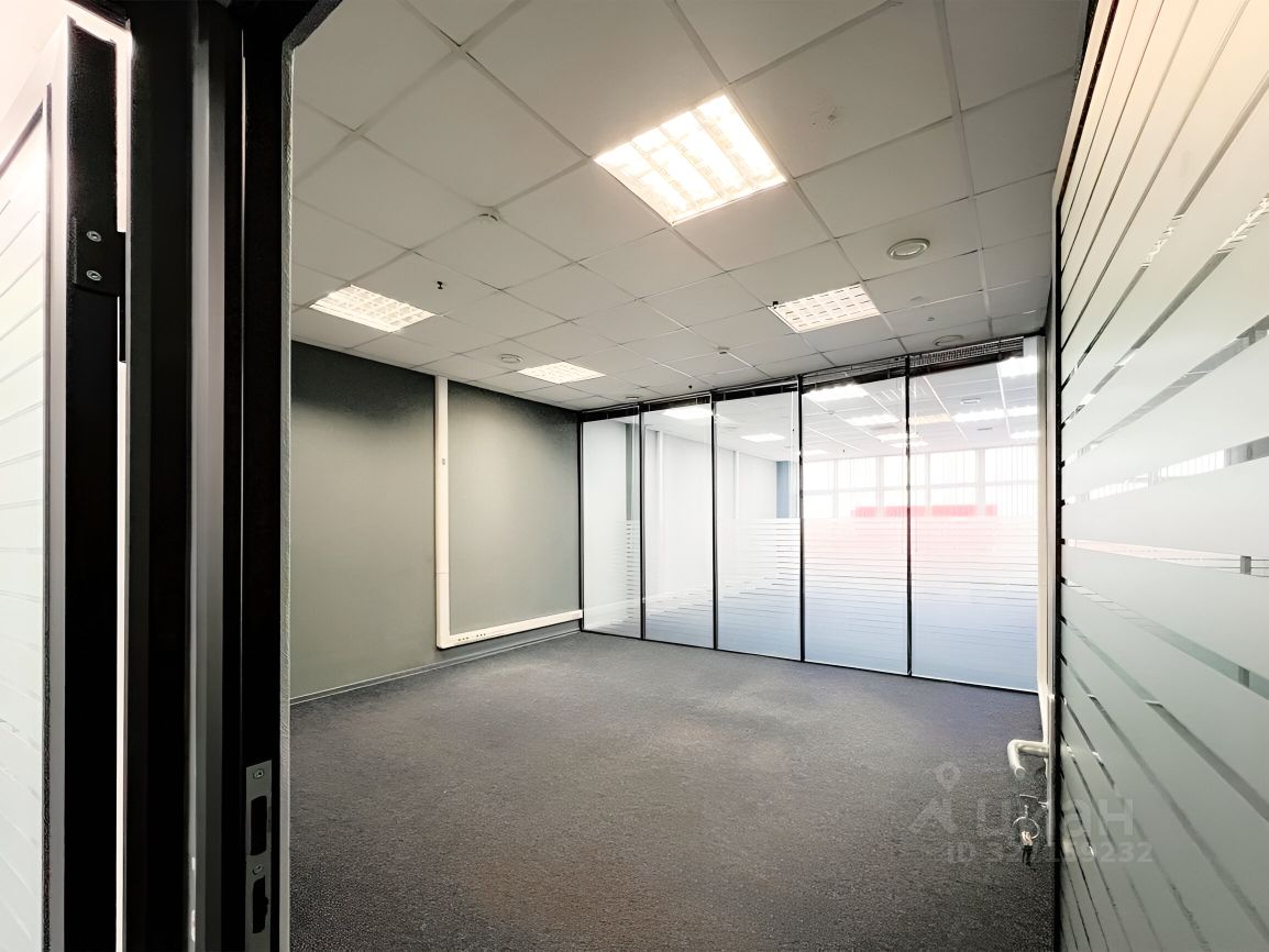 Офисное помещение из 8-х кабинетов со стеклянными перегородками, помещением кухни и мокрой точкой, приточно-вытяжная система вентиляции, сплинкерное пожаротушение, установлены АПС и системы оповещения при пожаре. Пол - ковролин, стены - обои под покраску, потолок армстронг.