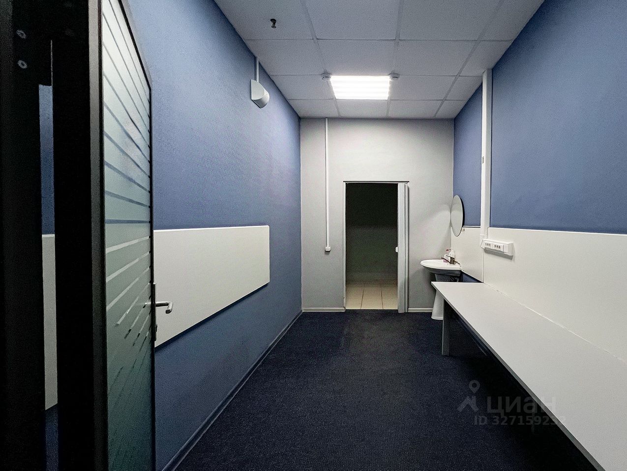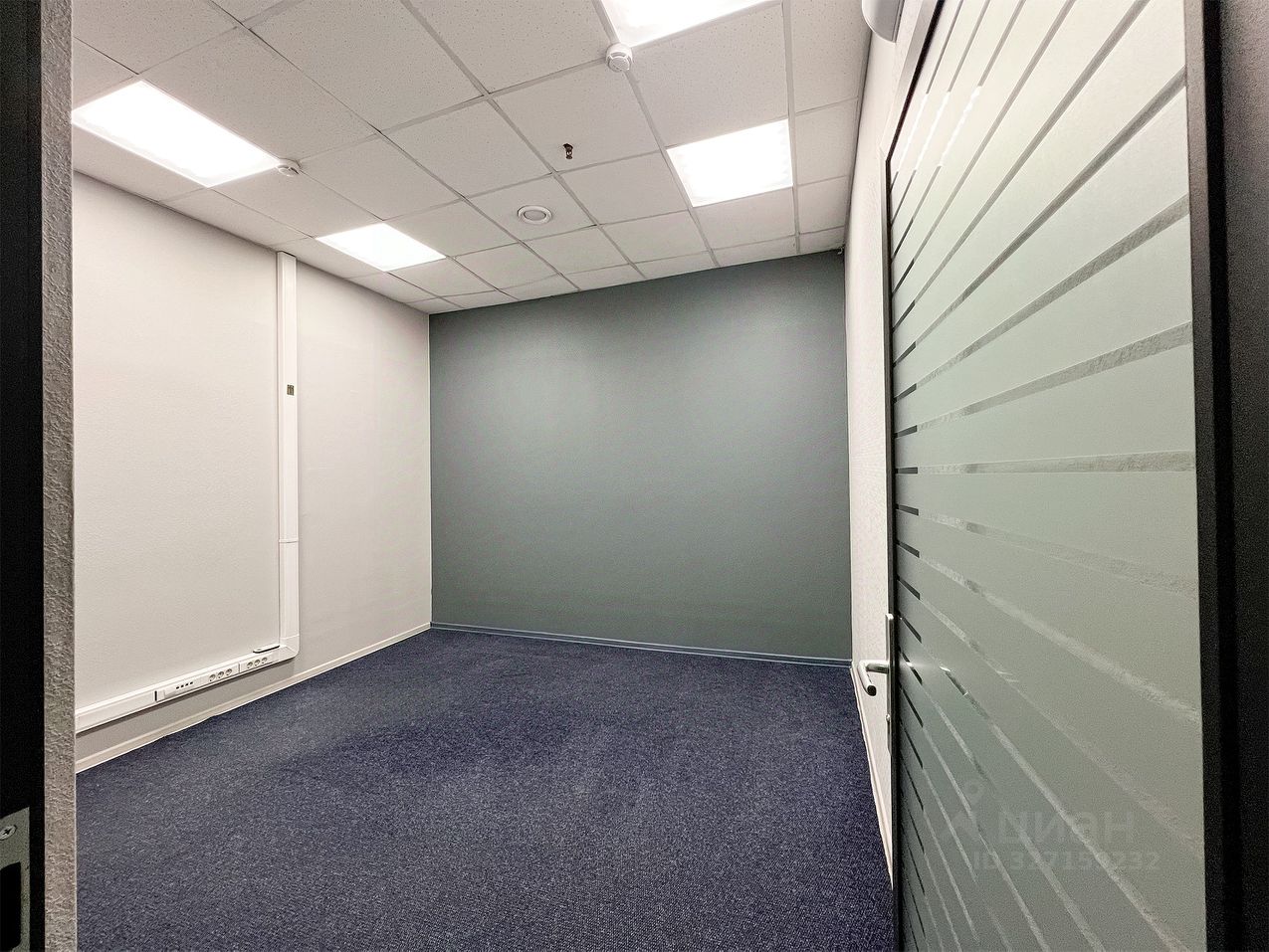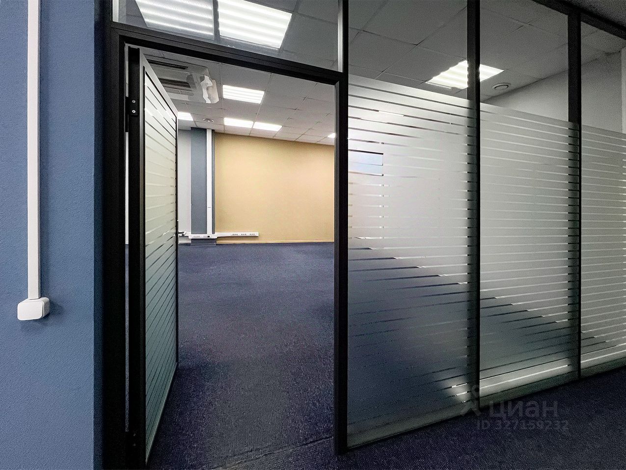 Офисное помещение из 8-х кабинетов со стеклянными перегородками, помещением кухни и мокрой точкой, приточно-вытяжная система вентиляции, сплинкерное пожаротушение, установлены АПС и системы оповещения при пожаре. Пол - ковролин, стены - обои под покраску, потолок армстронг.