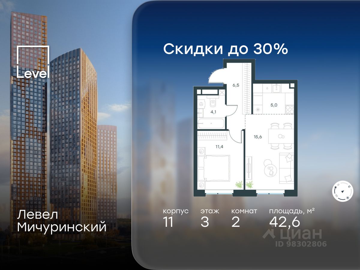продам 2-к, Левел Мичуринский ЖК, 1125 408 208 ₽