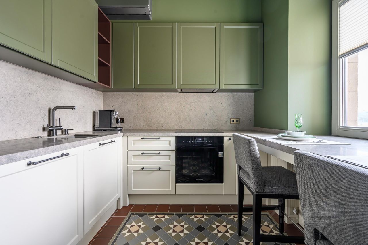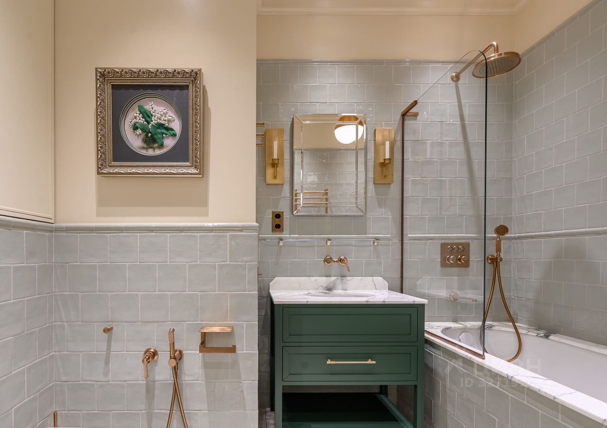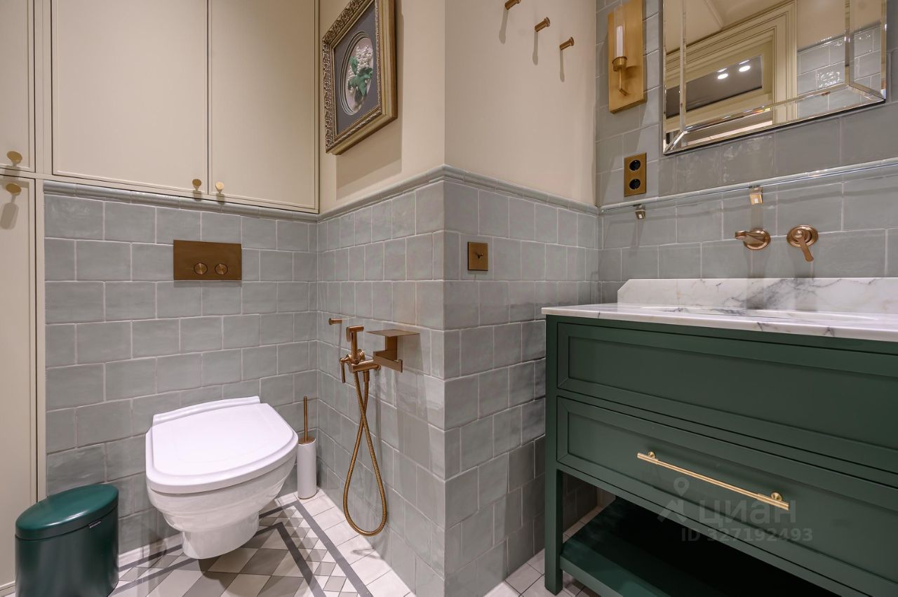 В санузле — сантехника Villeroy & Boch и смесители Gessi. Кухня и бытовая техника Miele: духовой шкаф, варочная панель, посудомоечная машина, холодильник, стиральная и сушильная машины.