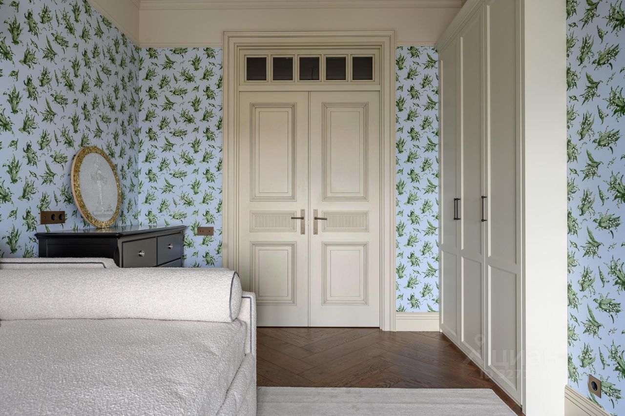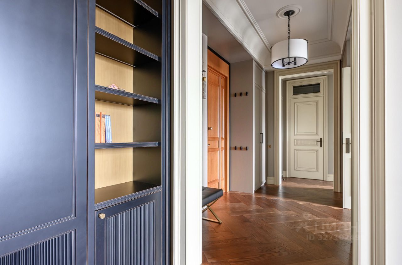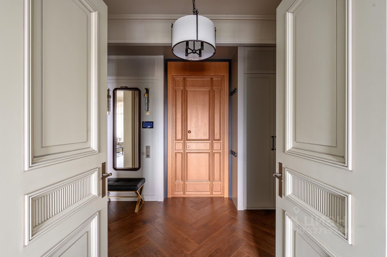 В квартире выполнен дизайнерский ремонт в стилистике дома: мрамор Calacatta Corchia и Ocean Blue, паркет из американского ореха, двери из массива, классическая лепнина.