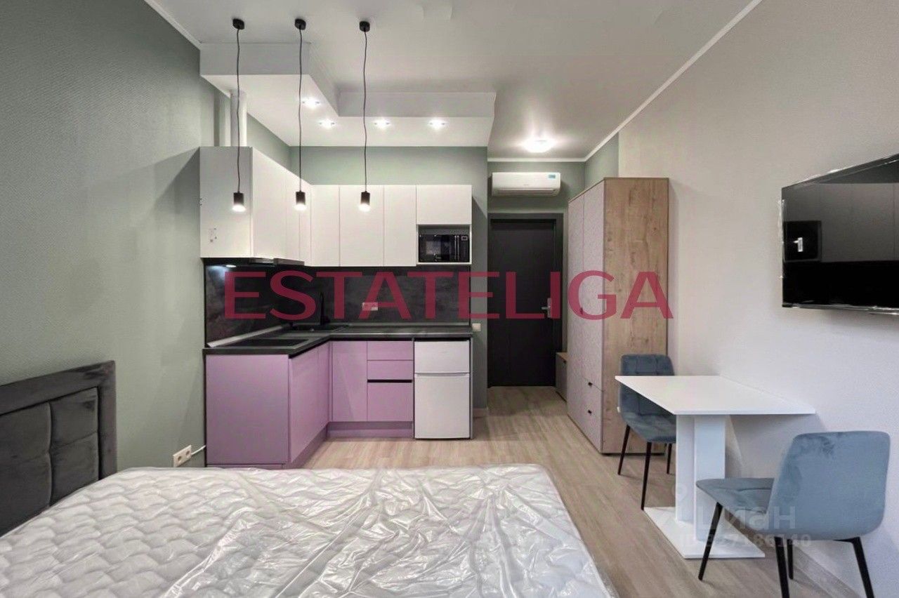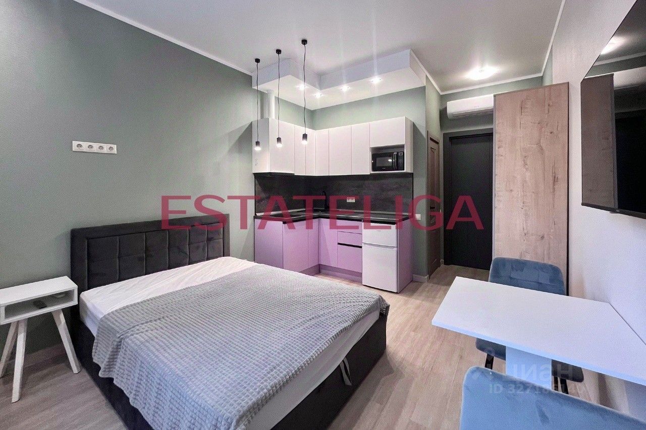 Функциональная планировка студии: зона кухни, обеденная зона, полноценное спальное место, совмещенный санузел с душем. В студии есть все необходимое для жизни: холодильник, телевизор, стиральная машина, варочная панель, вытяжка, микроволновая печь. Установлен кондиционер. Студия полностью готова к проживанию!