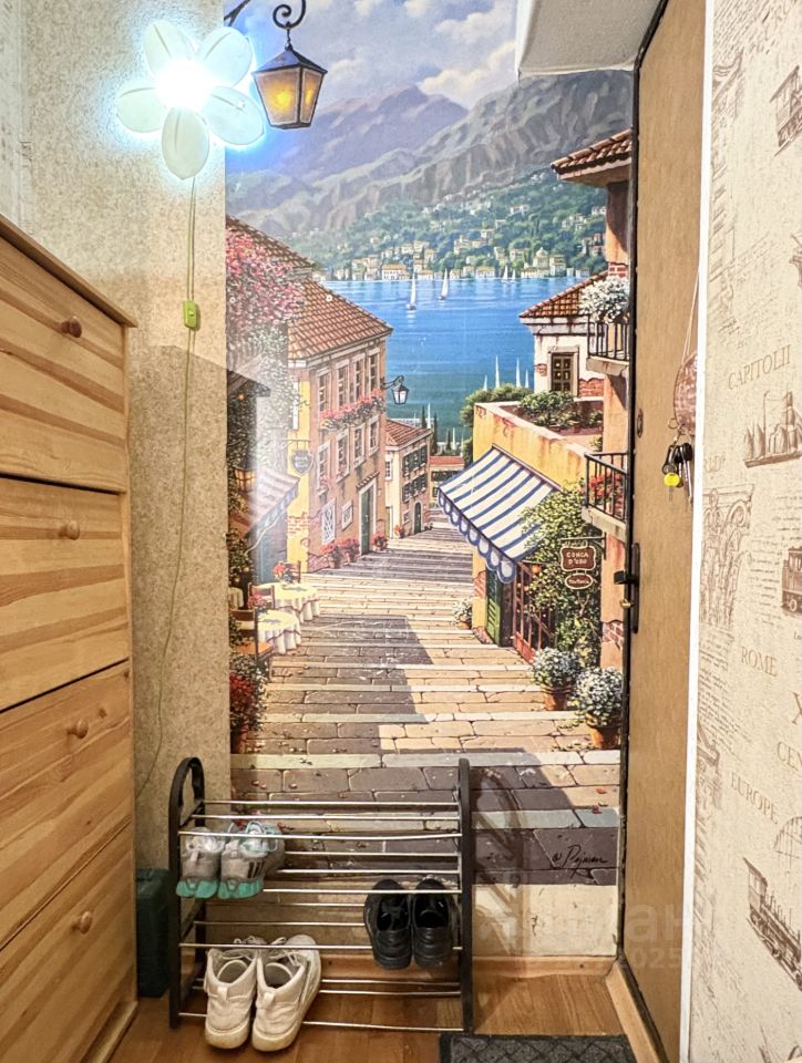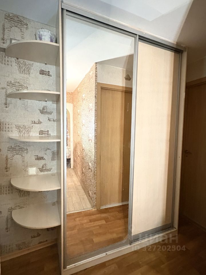 Прихожая: встроенный шкаф купе с зеркалом, тумба и полка для обуви.