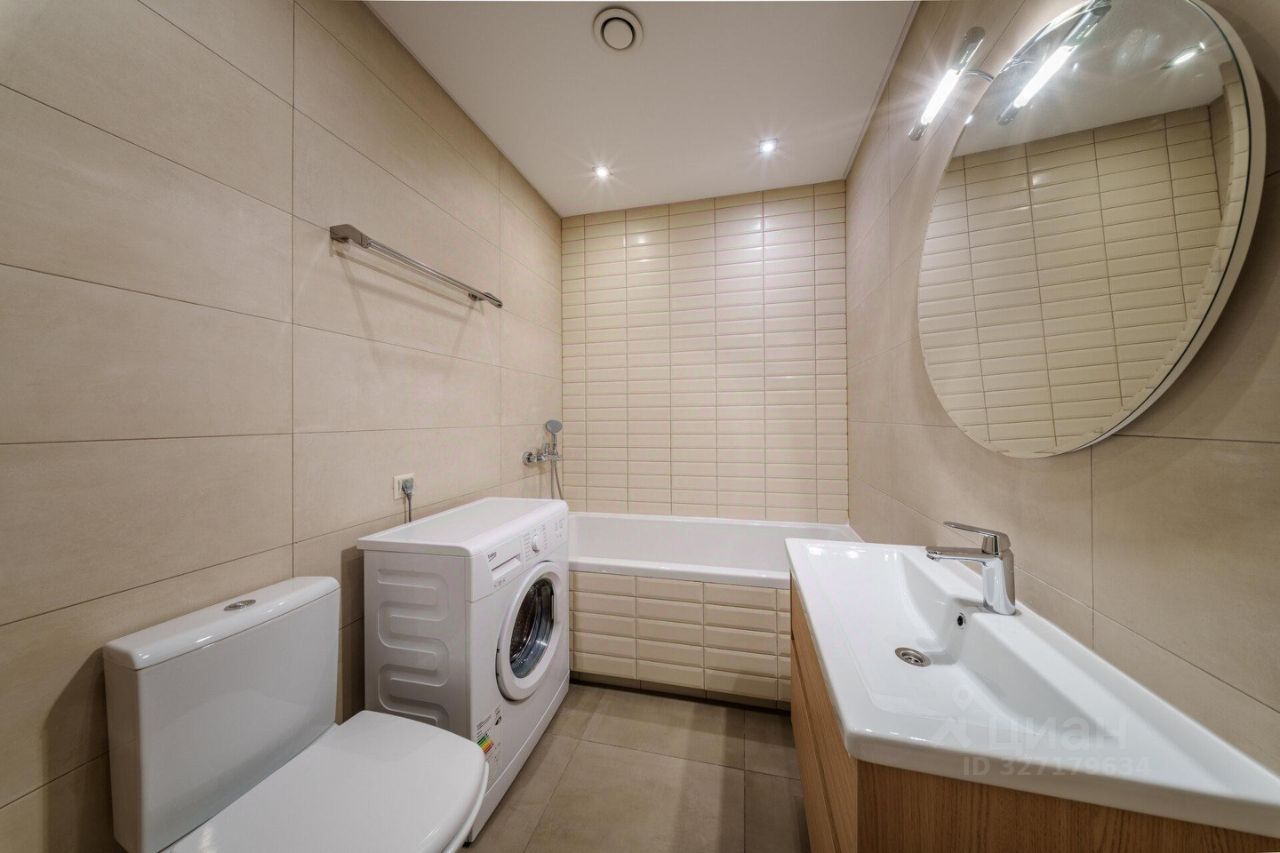 В квартире один совмещенный санузел с ванной, раковиной, зеркалом с подсветкой и стиральной машиной.