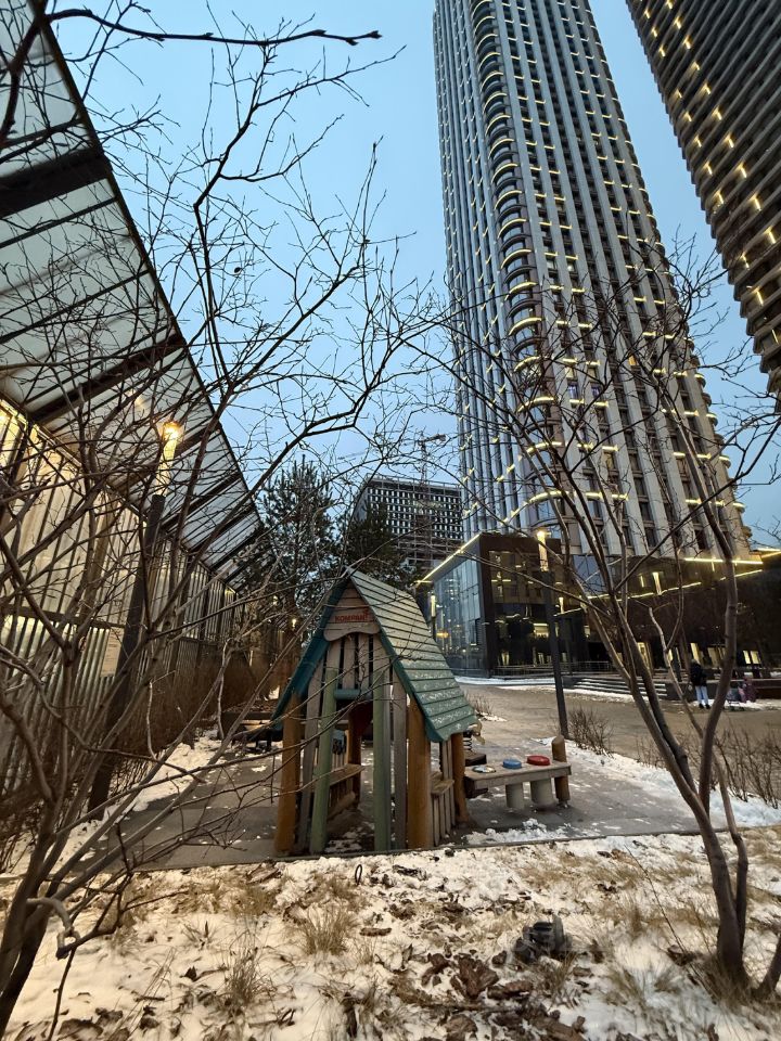 На территории комплекса есть разные кафе, магазины, фитнес-клуб. До метро - пара минут пешком.