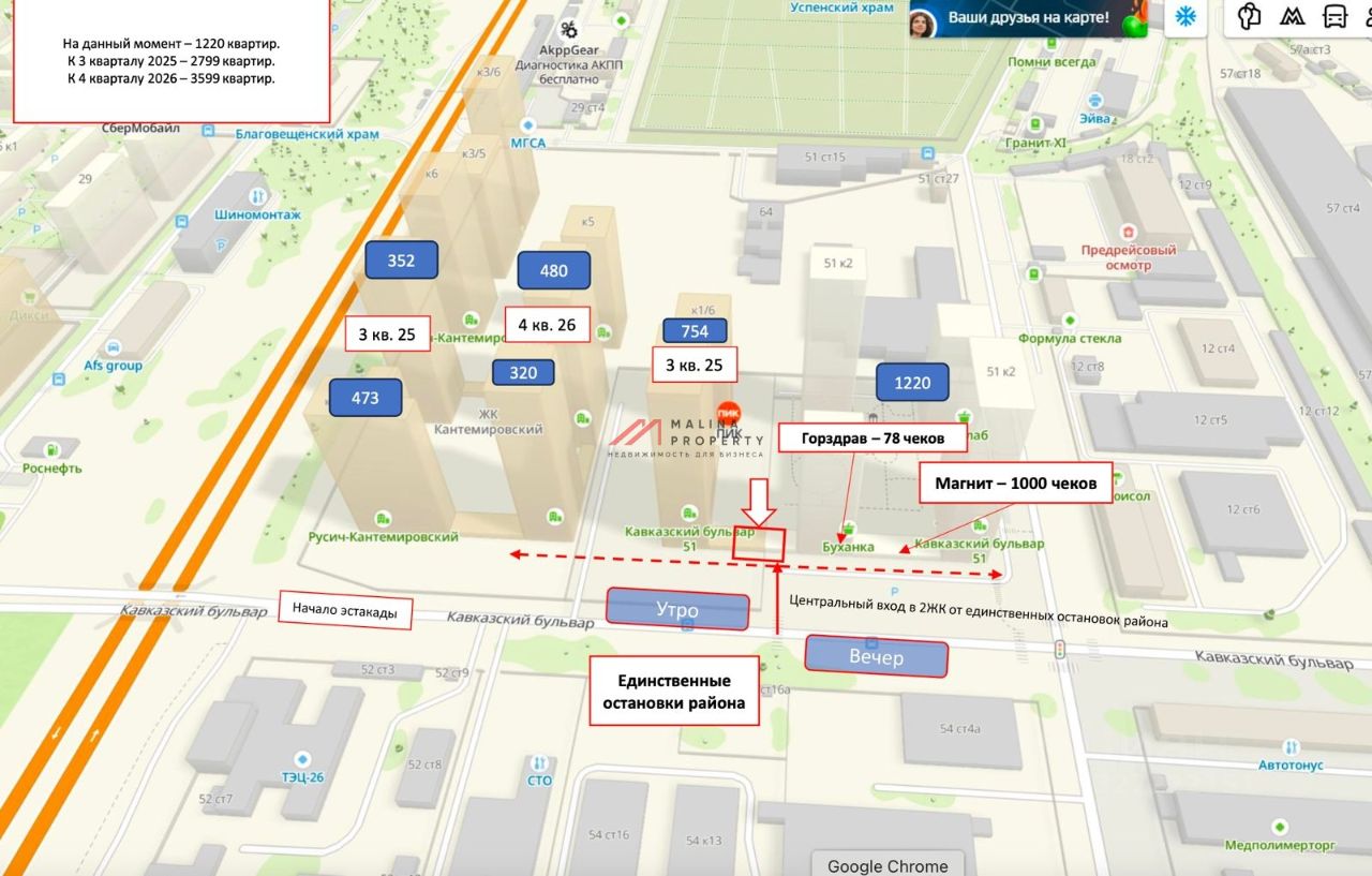 Помещение располагается в строящемся жилом комплексе ''Кавказский бульвар 51''. В проекте жилые дома высотой от 23 до 33 этажей, все 6 корпусов первой очереди сдаются с отделкой.