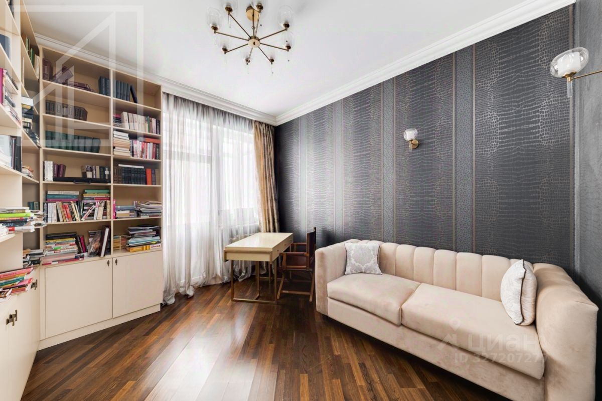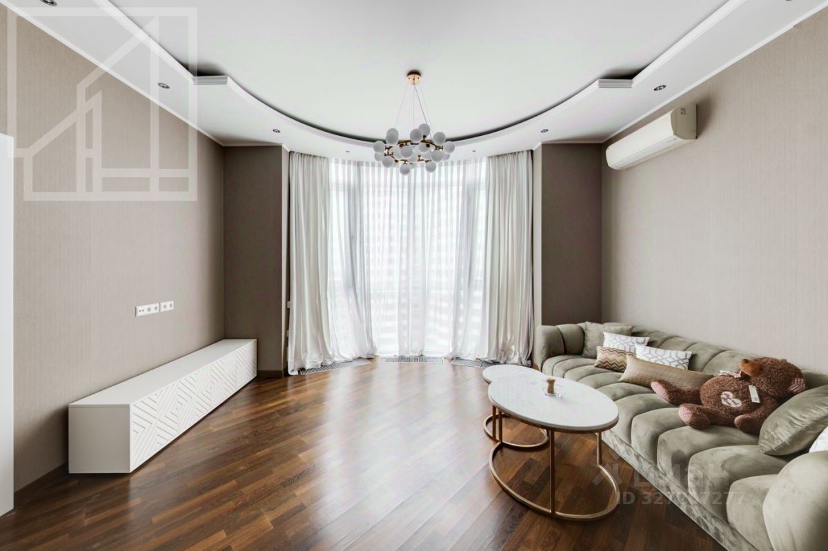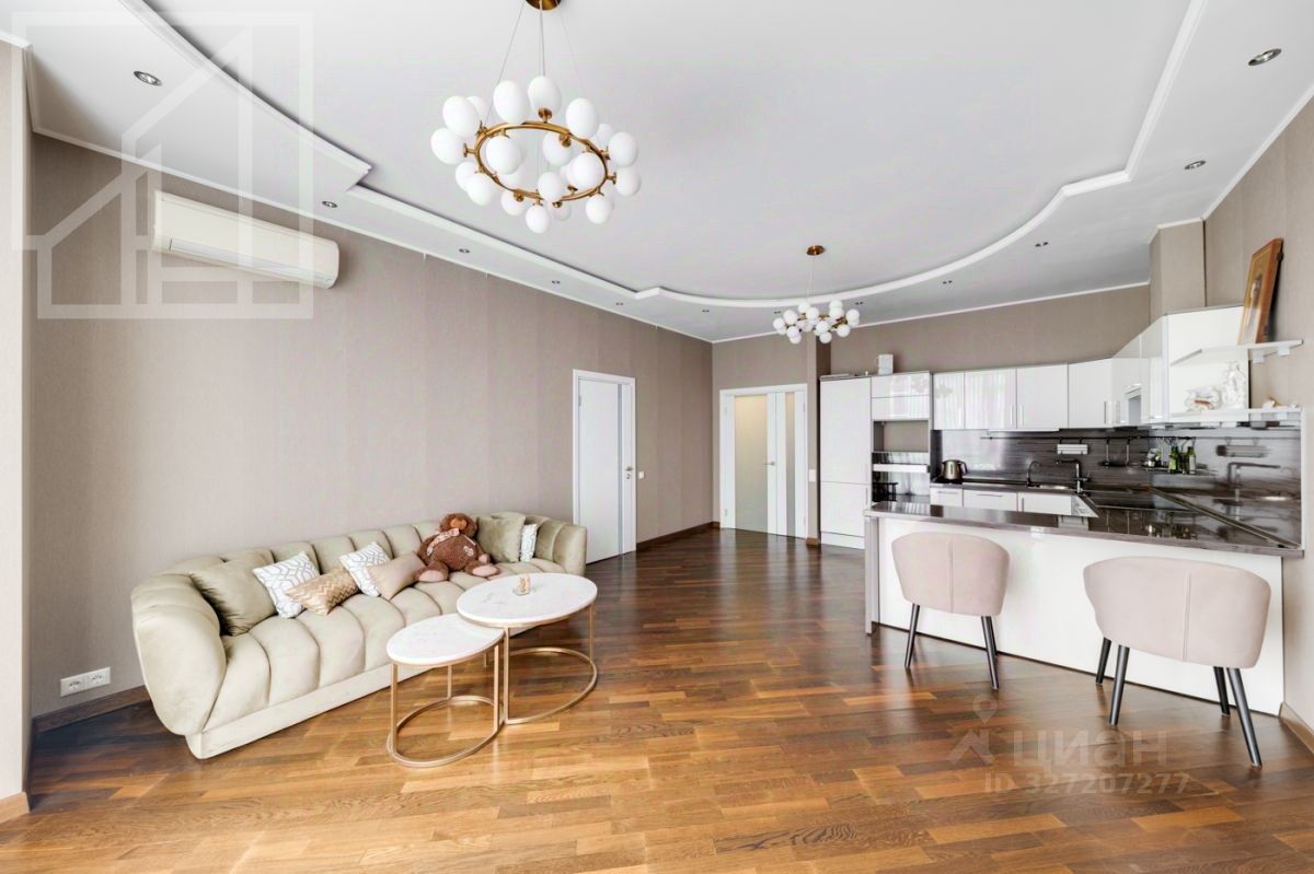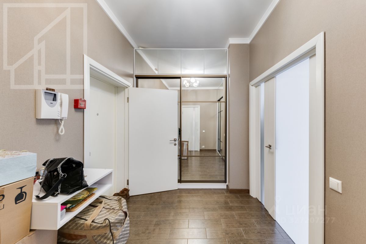 Планировка: гостиная-кухня, одна спальня, кабинет, гардеробная, один совмещенный санузел и гостевой санузел. В квартире выполнен современный авторский ремонт. Окна выходят на внутренний двор дома. В квартире установлена система кондиционирования, система подогрева полов.