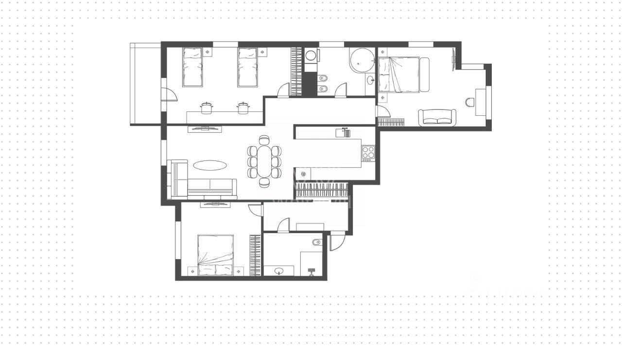Планировка включает гостиную-столовую на восемь персон, кухню с выходом на балкон, три спальни с системами хранения вещей, просторную гардеробную. В санузлах установлены джакузи и душевая кабина, в каждой комнате — кондиционер. Окна выходят на две стороны с видами на город.