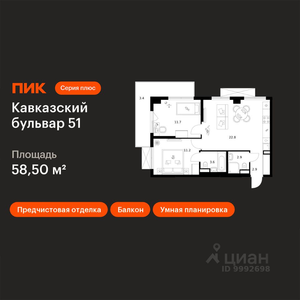 Продаётся 2-комн. квартира площадью 58,5 кв.м на 10 этаже 24 этажного дома (Корпус 3.5, Секция 2) проекта ПИК Кавказский бульвар 51. Светлый просторный подъезд на уровне земли, функциональная планировка, большие окна, предчистовая отделка.