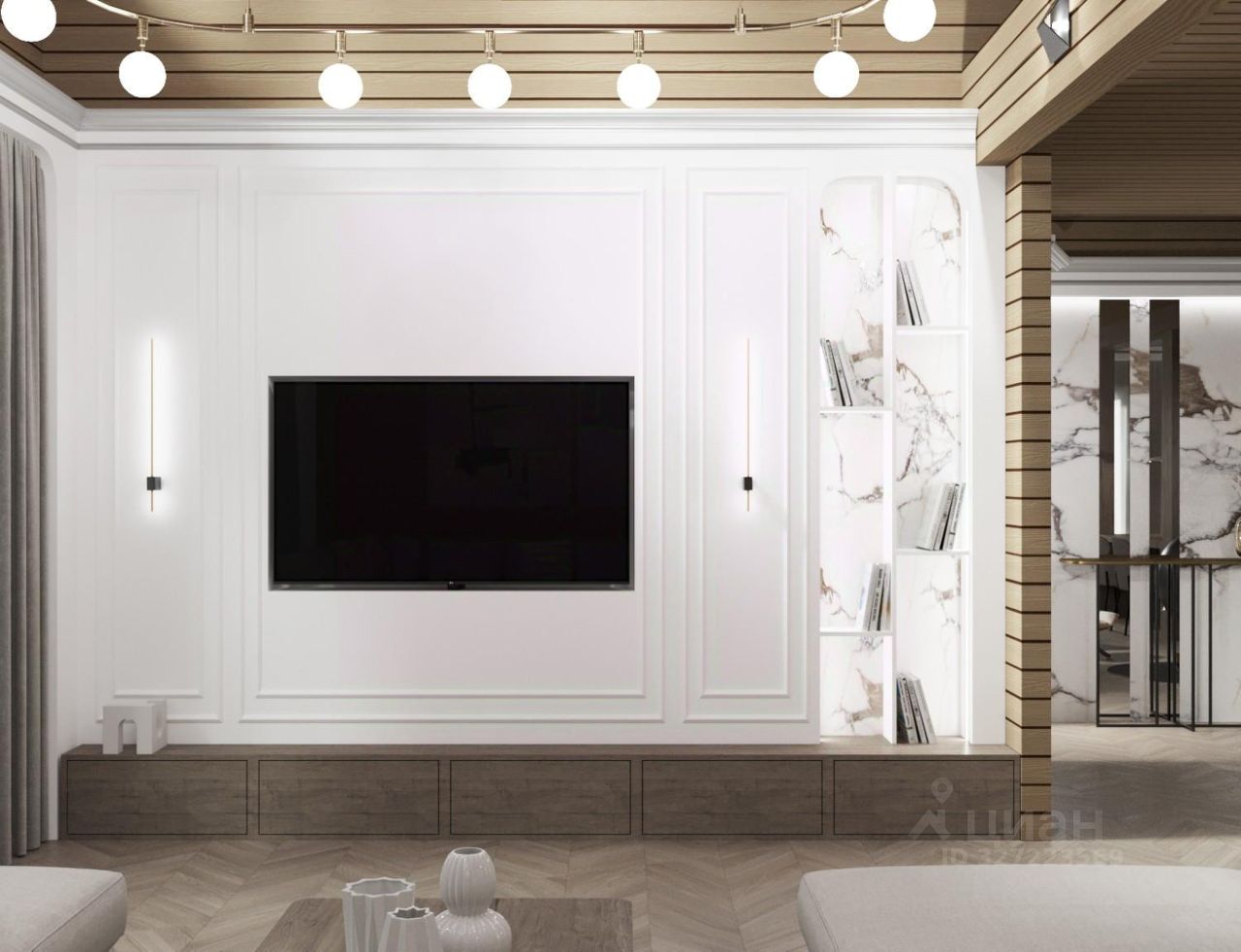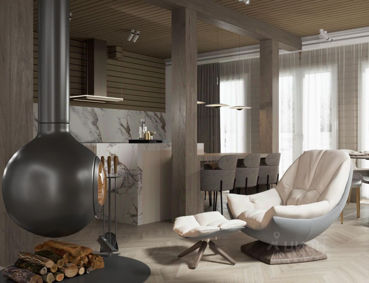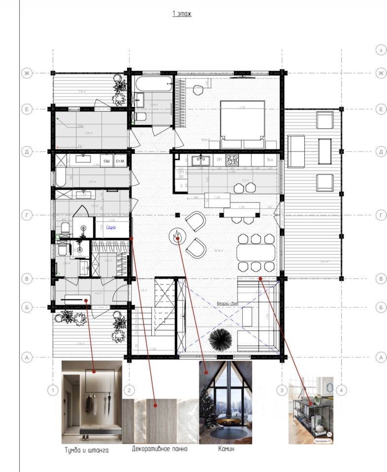 По планировке. 4 спальни, кухня гостиная. отдельная постирочная зона и 4 сан узла. Можно поставить финскую сауну. Планировка есть в фотографиях. На полу будет инженерная доска.