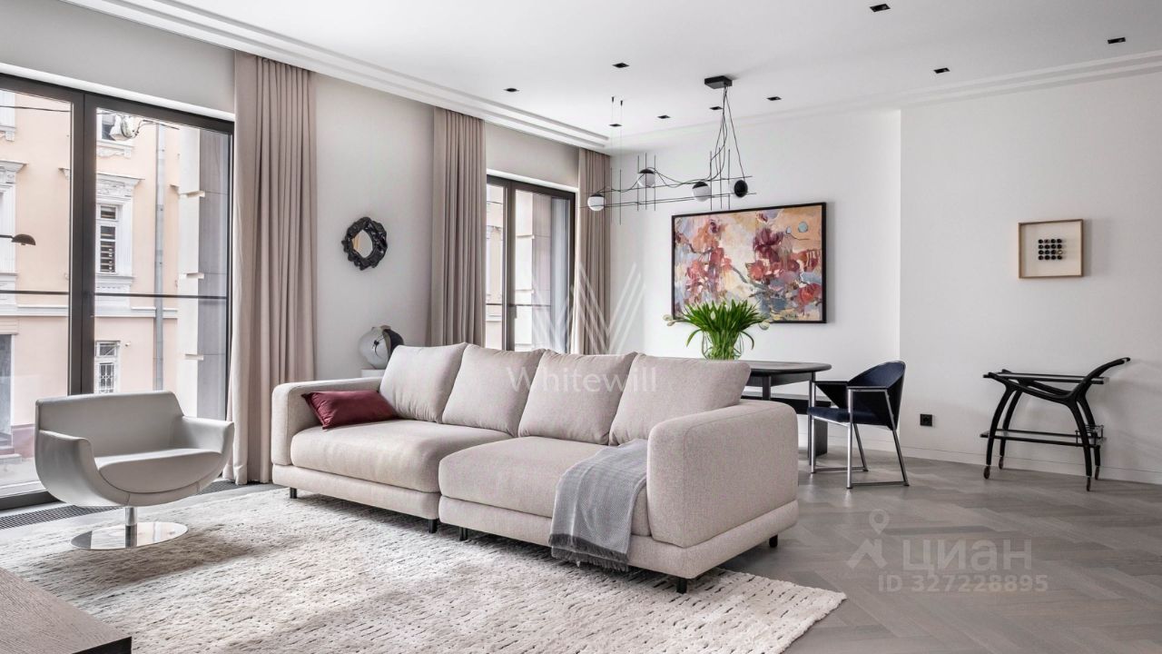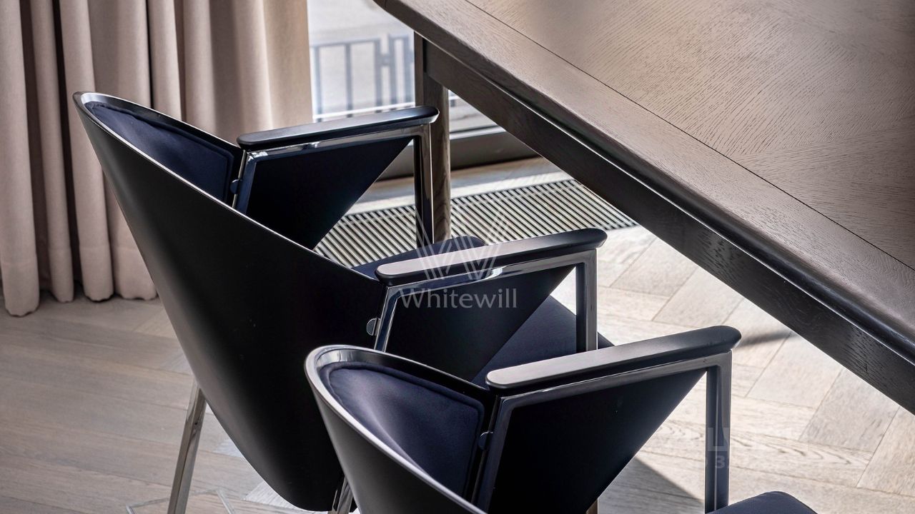 В квартире в клубном доме ''Тургенев'' нет места компромиссам: каждый предмет достоин музея дизайна, каждый штрих наполнен смыслом. Отделка по проекту нидерландского бюро Wolterinck становится отправной точкой. Светлые стены и кремовые ткани наполняют пространство покоем, холодный блеск металла и паркет цвета мокрого песка добавляют энергию. Лаконичная графитовая кухня с мраморным фартуком и барной стойкой излучает монолитную силу.