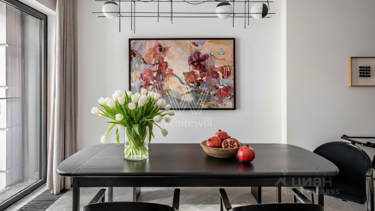 Люстра Plot Frame от Vistosi из матового муранского стекла ручной работы превращает столовую зону в арт-заявление. За тёмным деревянным столом — отреставрированные обеденные стулья 1970-х годов из Голландии. Картина в оттенках граната и персика вносит движение цвета, которому вторят полки и текстиль оттенка гранатовой кожуры.