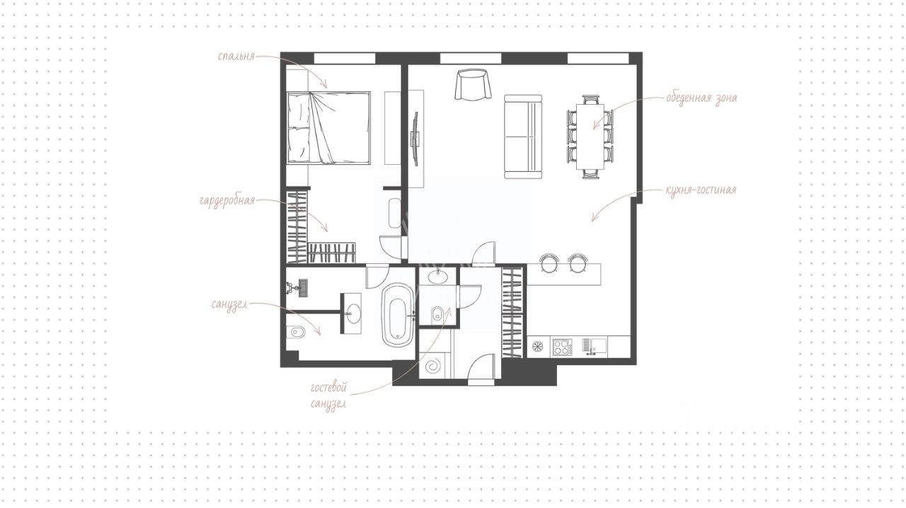 Главное о квартире: второй этаж, 76 метров, кухня-гостиная, спальня с гардеробной, два санузла. Система ''умный дом'', техника Smeg. Квартира подходит для одного или для пары.