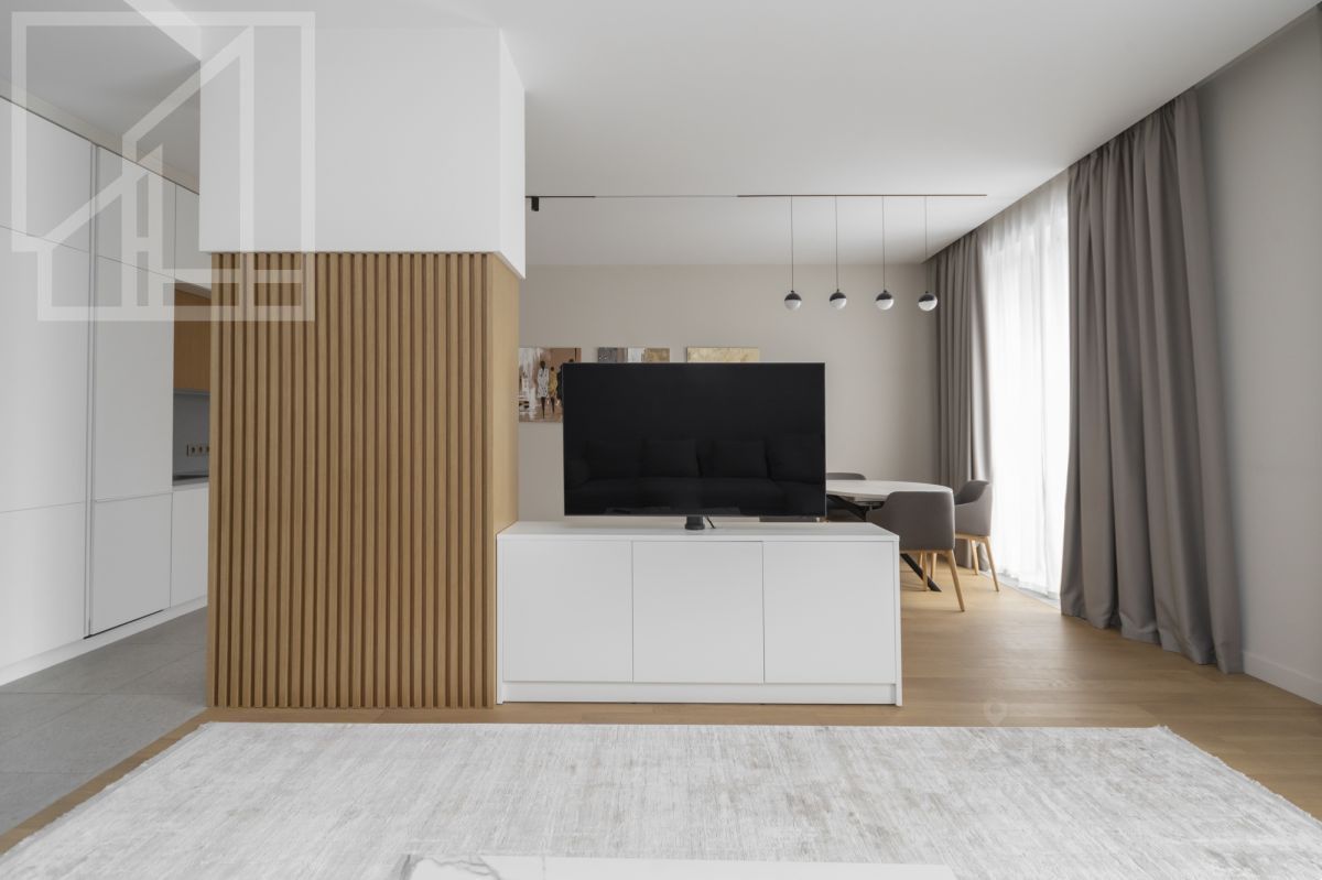 Планировка: гостиная-кухня, одна спальня, один совмещенный санузел и гостевой санузел. В квартире выполнен современный авторский ремонт. Окна выходят на тихий переулок. В квартире установлена приточно-вытяжная система вентиляции и кондиционирования, система подогрева полов.