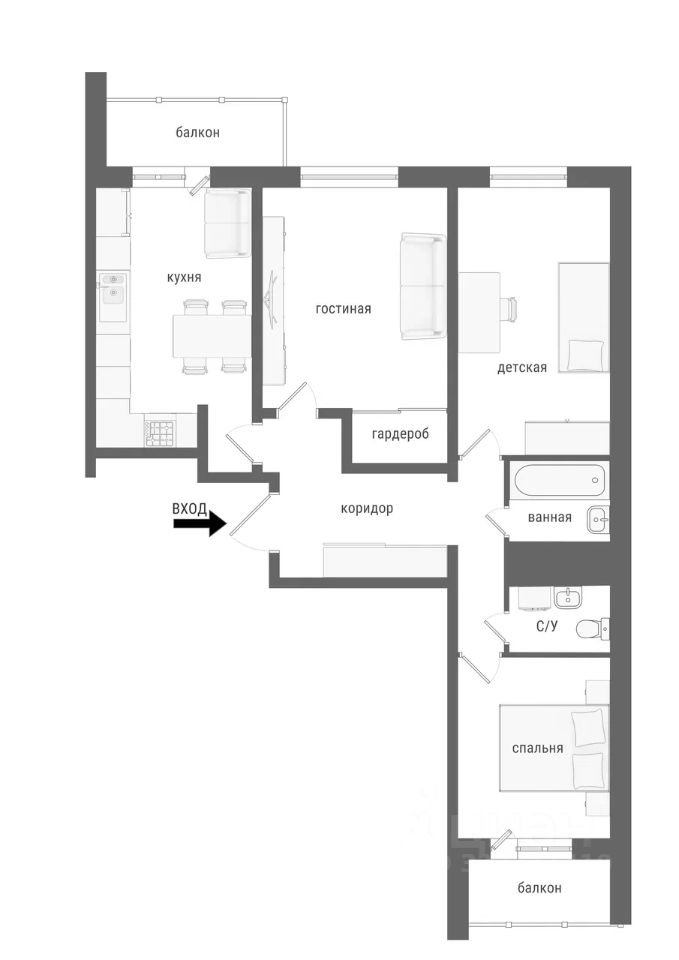 Кухня: Готовая функциональная кухня со стильным гарнитуром IKEA и современной встраиваемой техникой: индукционная плита Bosch, духовой шкаф Bosch с конвекцией, системой доводчиков и самоочистки, холодильник LG. Гостиная с гардеробной: Пространство для отдыха, в котором остаются: вместительный гардероб, удобный диван с ортопедическим матрасом бренда Андерсон, настенный тв модуль, кресло, стол и стул. Детская 1: Обустроена для ребенка: шкаф IKEA, письменный стол IKEA, спортивный настенный инвентарь (шведская стенка/турник), стильные кубические полки IKEA для хранения. Детская 2: Светлая комната с хорошим потенциалом также оборудована мебелью IKEA. Прихожая: Вместительные встроенные шкафы IKEA для хранения одежды и обуви. Балкон: Функциональное пространство со шкафом и специальной полкой для хранения автомобильных колес и креплением для 2-х велосипедов