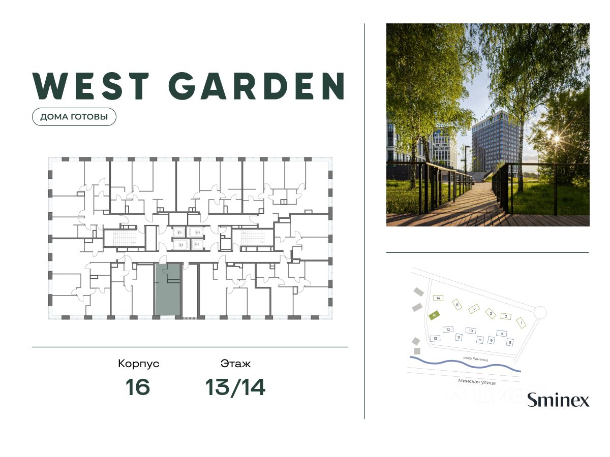 West Garden - это собрание клубных домов высотой 12-14 этажей в собственном парке 16 гектаров вдоль реки. Просторный среднеэтажный квартал расположен на Минской улице, в респектабельном Западном округе столицы. Вокруг премиальное окружение и более 1000 гектаров парков.