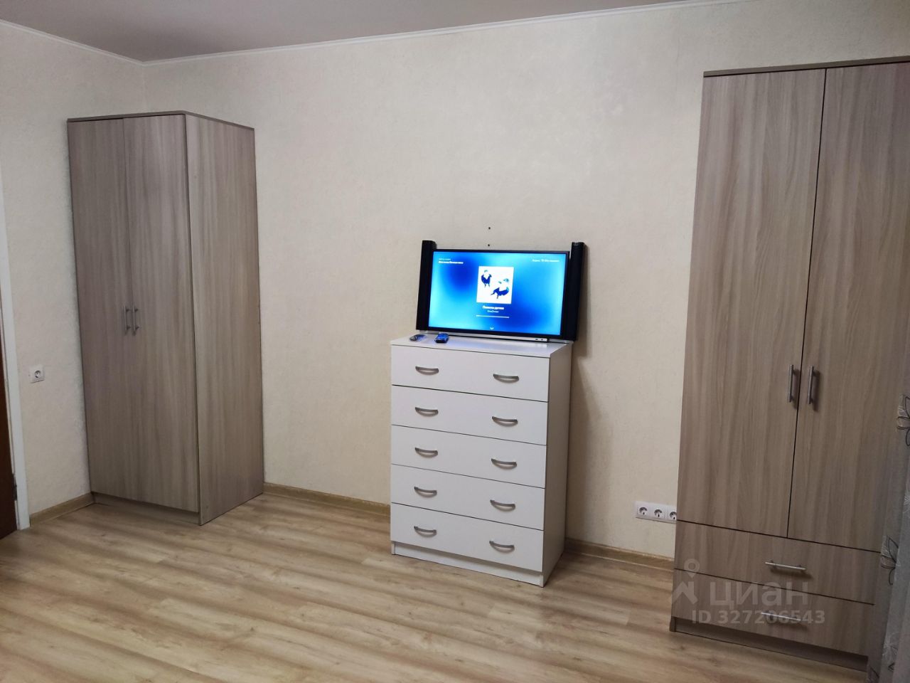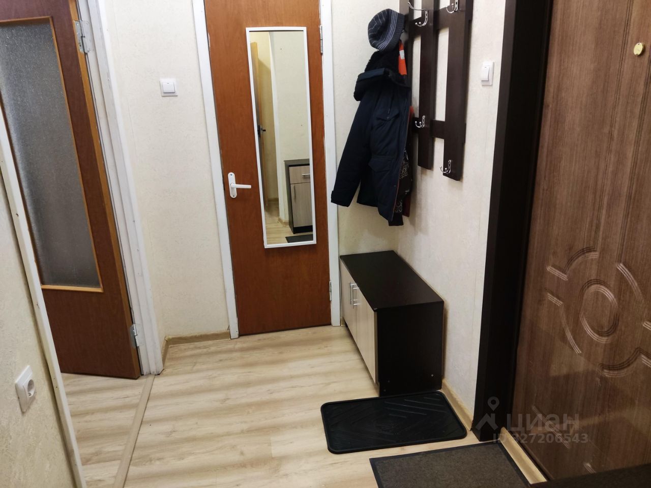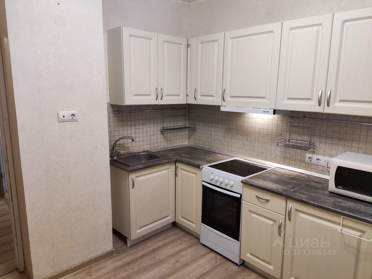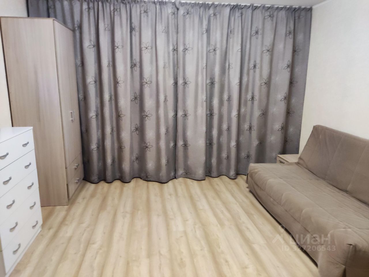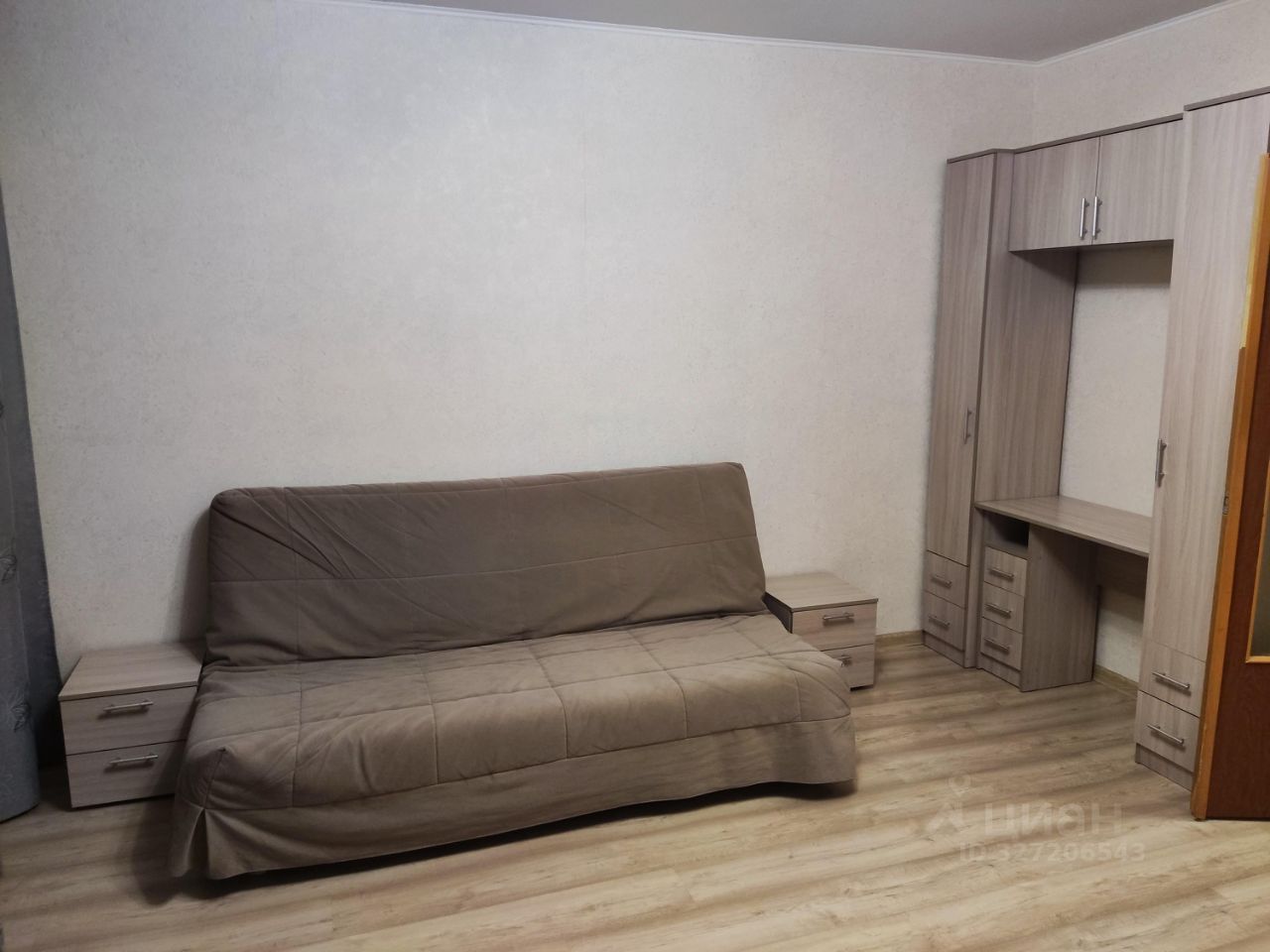 В квартире выполнен косметический ремонт. Просторная кухня оборудована необходимой бытовой техникой, включая холодильник и микроволновую печь. В комнате установлены шкафы и диван, что обеспечивает комфортное проживание.