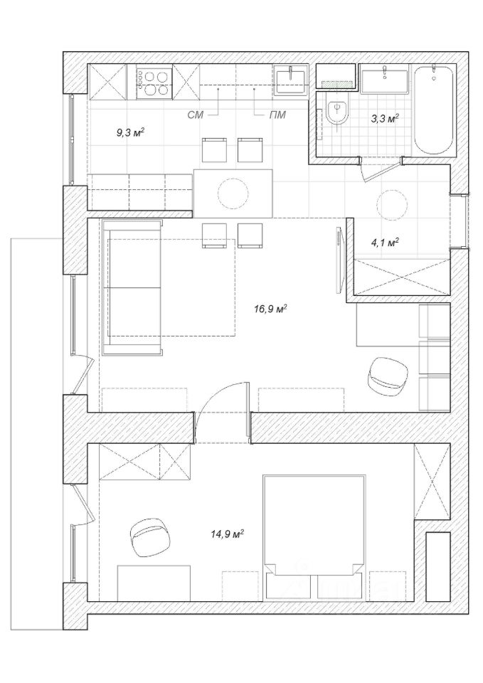Планировка: кухня-гостиная с зоной кабинета + изолированная спальня, совмещенный санузел. Для некурящей семьи из 2-3 человек (два взрослых или семья с ребенком). Оснащение: — в гостиной: раскладной диван, ТВ, рабочий стол, кондиционер. — кухня: холодильник, стиральная и посудомоечная машины, микроволновка, духовка с выкатной тележкой, варочная панель, вытяжка, фильтр воды. — раскладной обеденный стол. — теплый пол (кухня + прихожая) — балкон застеклен, выход из гостиной и спальни (остекление старое) — общий коридор отгорожен дверью с электронным замком (можно хранить коляску/велосипед по согласованию).
