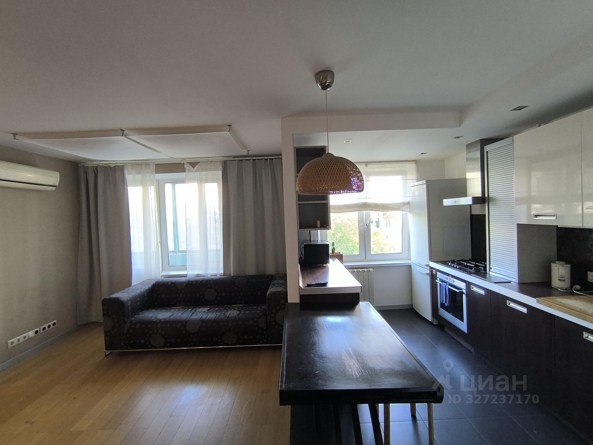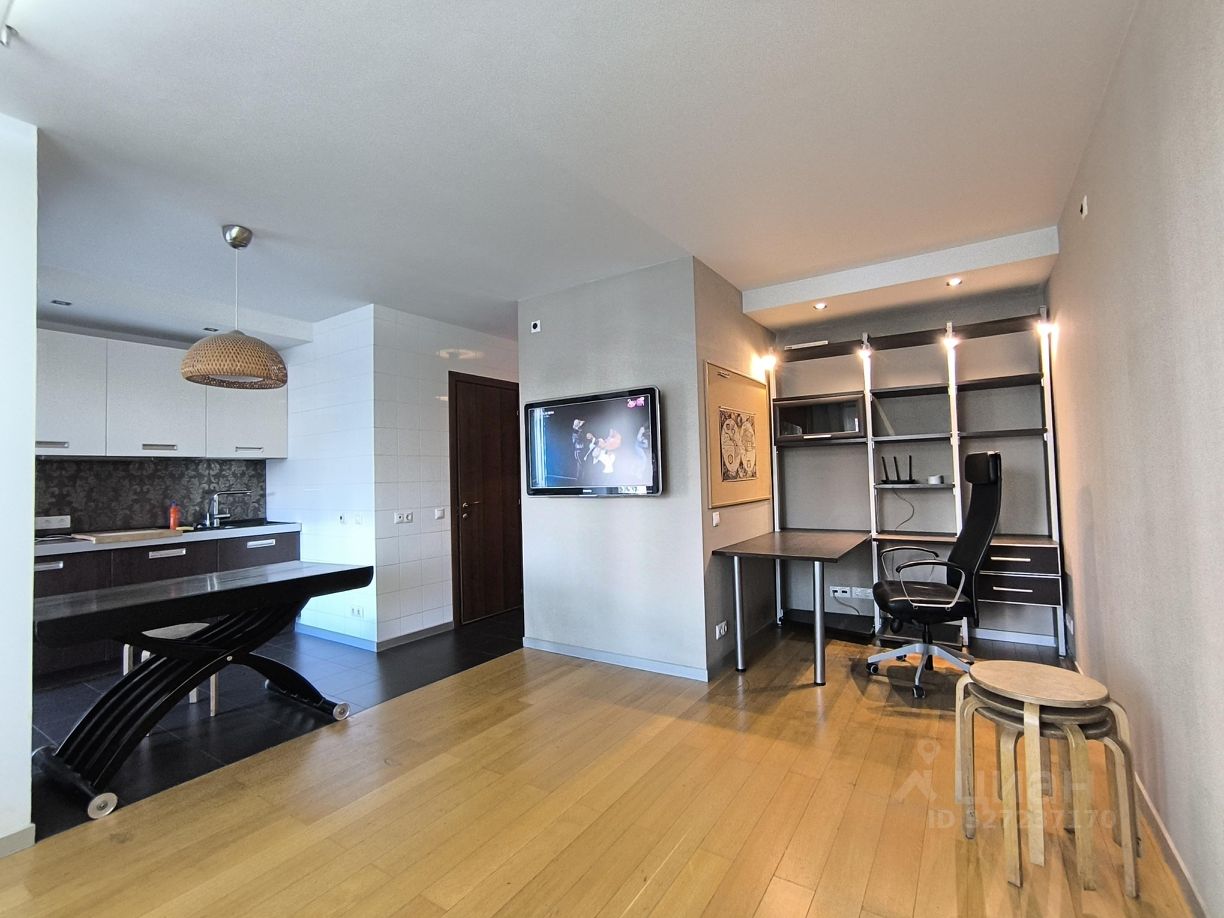 Планировка: кухня-гостиная с зоной кабинета + изолированная спальня, совмещенный санузел. Для некурящей семьи из 2-3 человек (два взрослых или семья с ребенком). Оснащение: — в гостиной: раскладной диван, ТВ, рабочий стол, кондиционер. — кухня: холодильник, стиральная и посудомоечная машины, микроволновка, духовка с выкатной тележкой, варочная панель, вытяжка, фильтр воды. — раскладной обеденный стол.