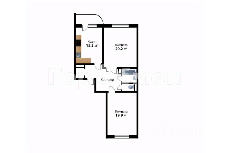 Просторная 2-комнатная квартира с большой кухней (15,2 кв.м.),