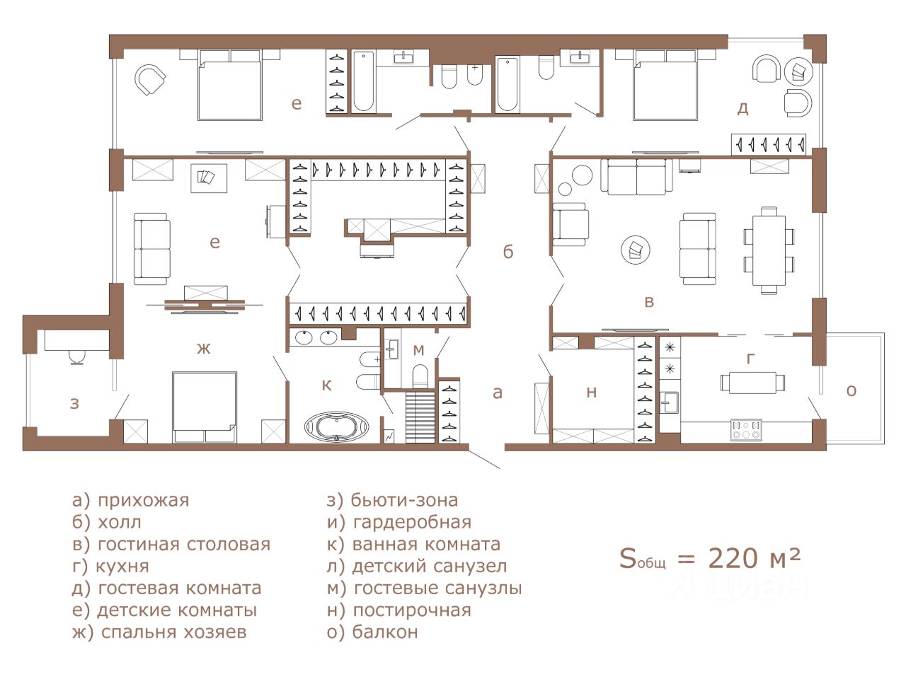 Площадь: 220 кв. м. 3 изолированные спальни, каждая со своим санузлом и мастер-блок с большой гардеробной комнатой, кухня-гостиная с выходом на террасу.