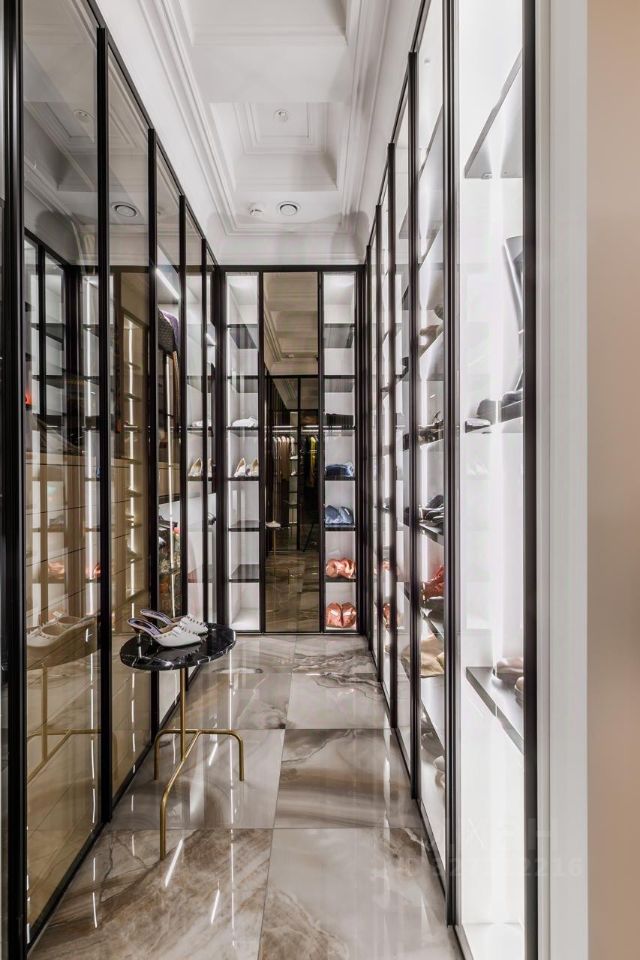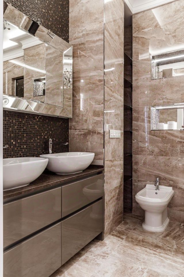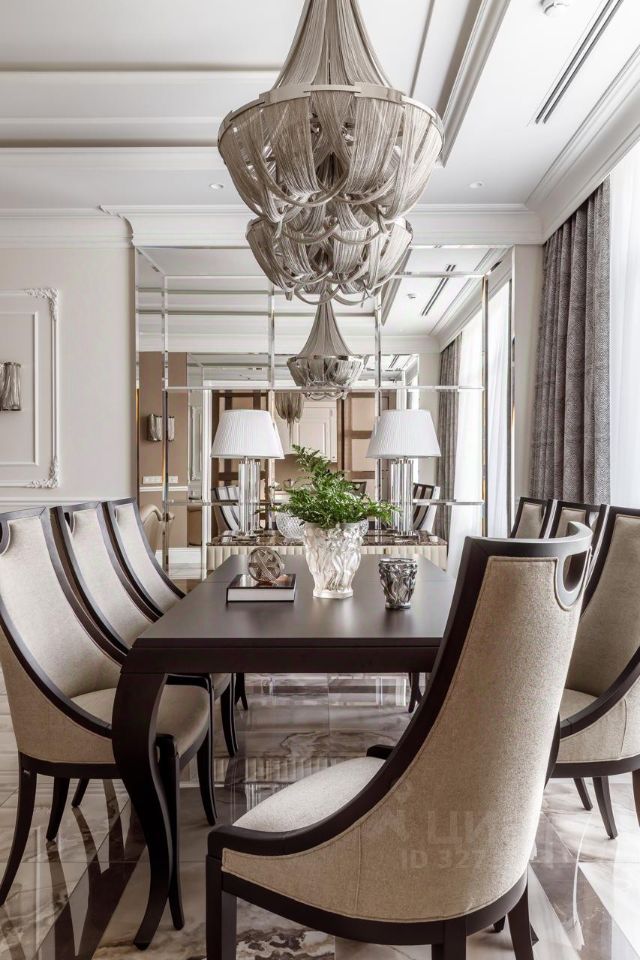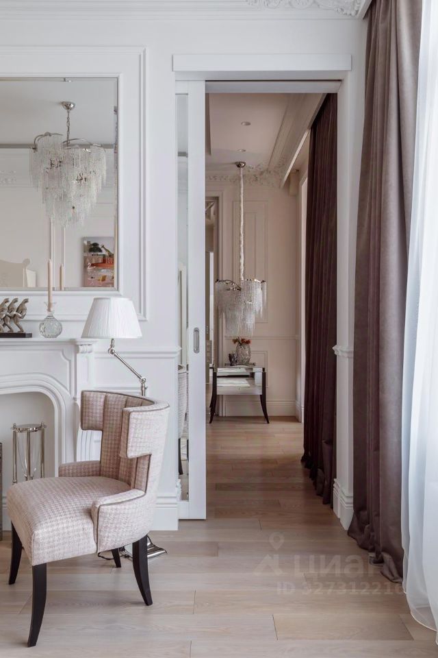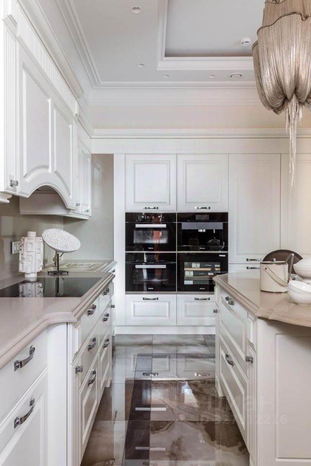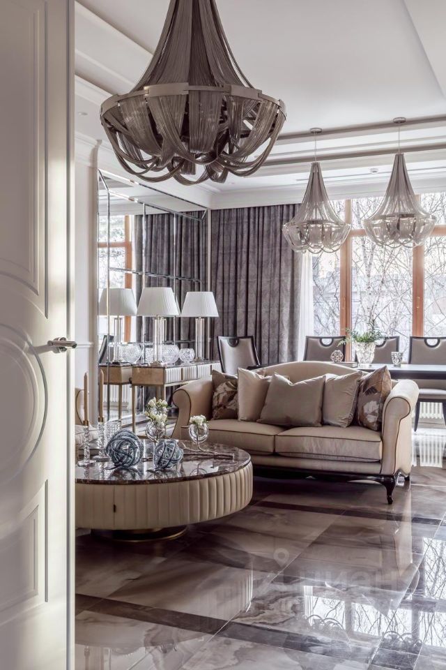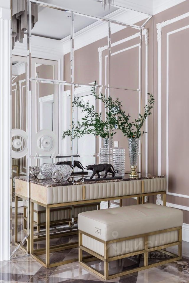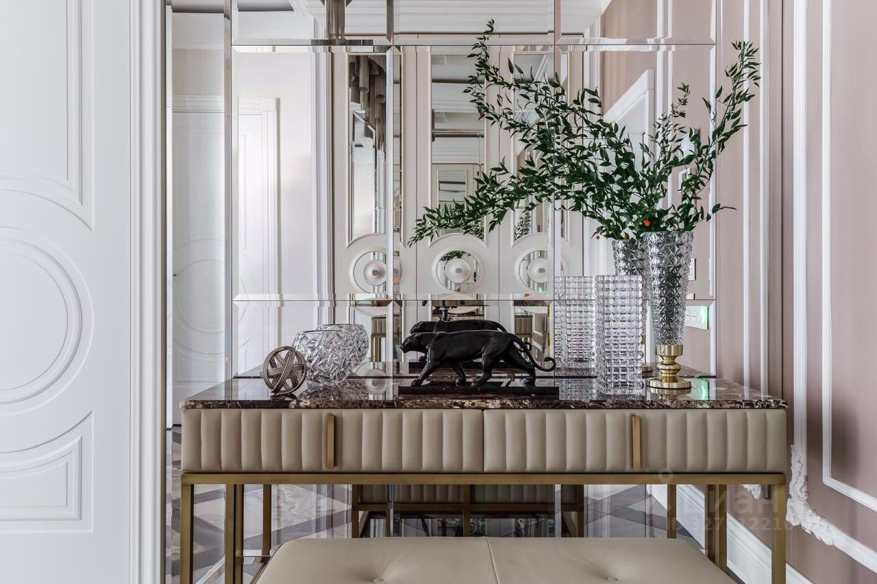 В холле — многоуровневые потолки с лепниной и подсветкой, люстры Terzani, распашные двери 2,4 м по эскизам итальянских мастеров Barausse. Интерьер экспонировался в изданиях: Hi Home, Salon Interior