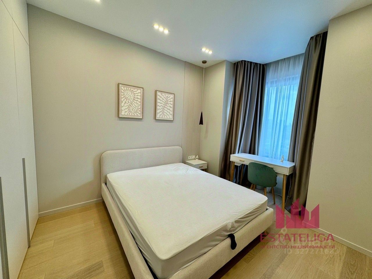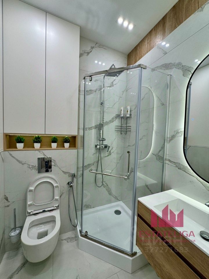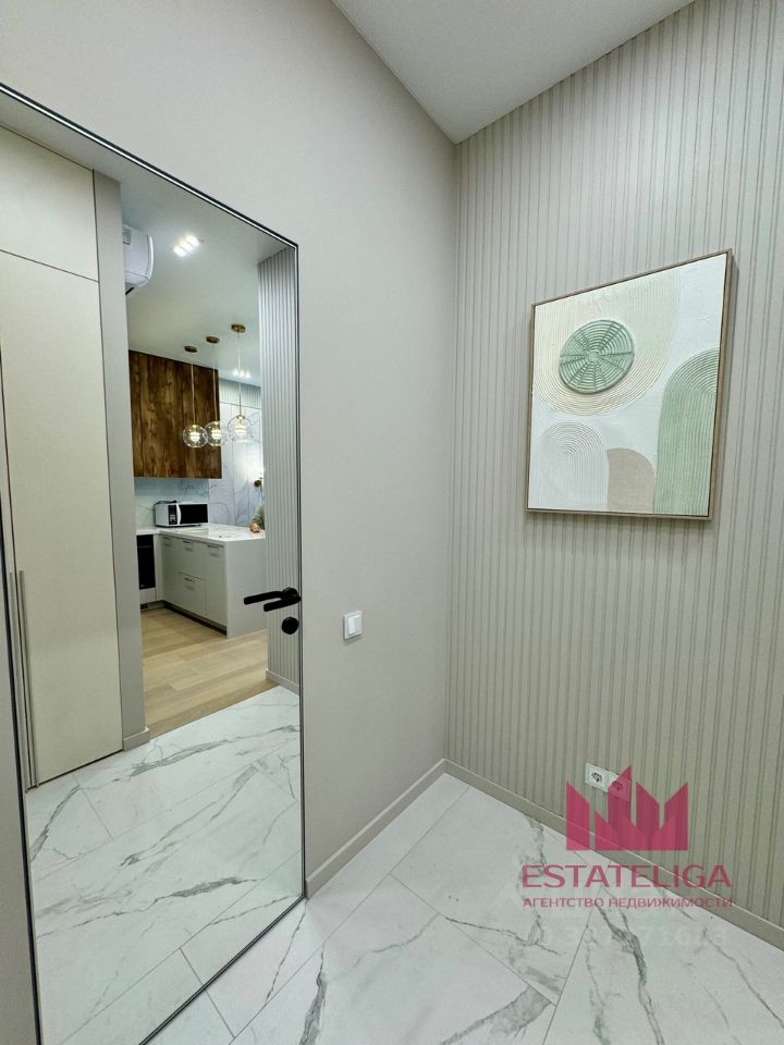 В квартире закончен дизайнерский ремонт. Планировка включает в себя изолированную спальную комнату, кухня-гостиную, ванную комнату и прихожую.