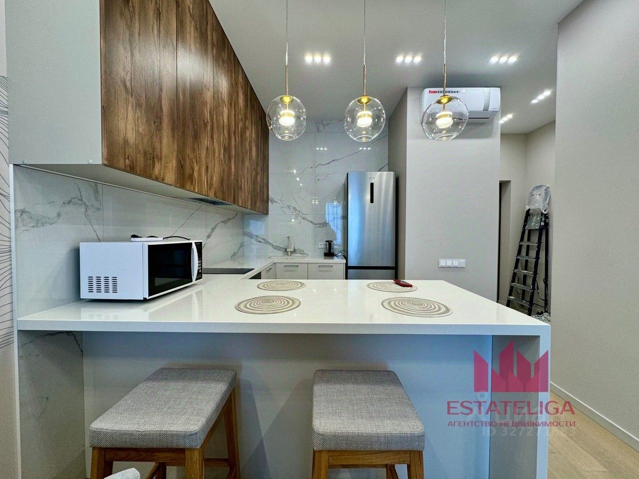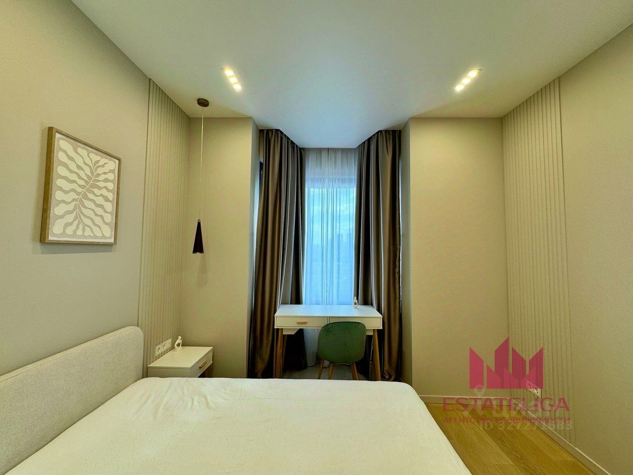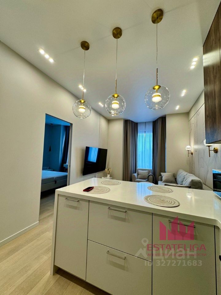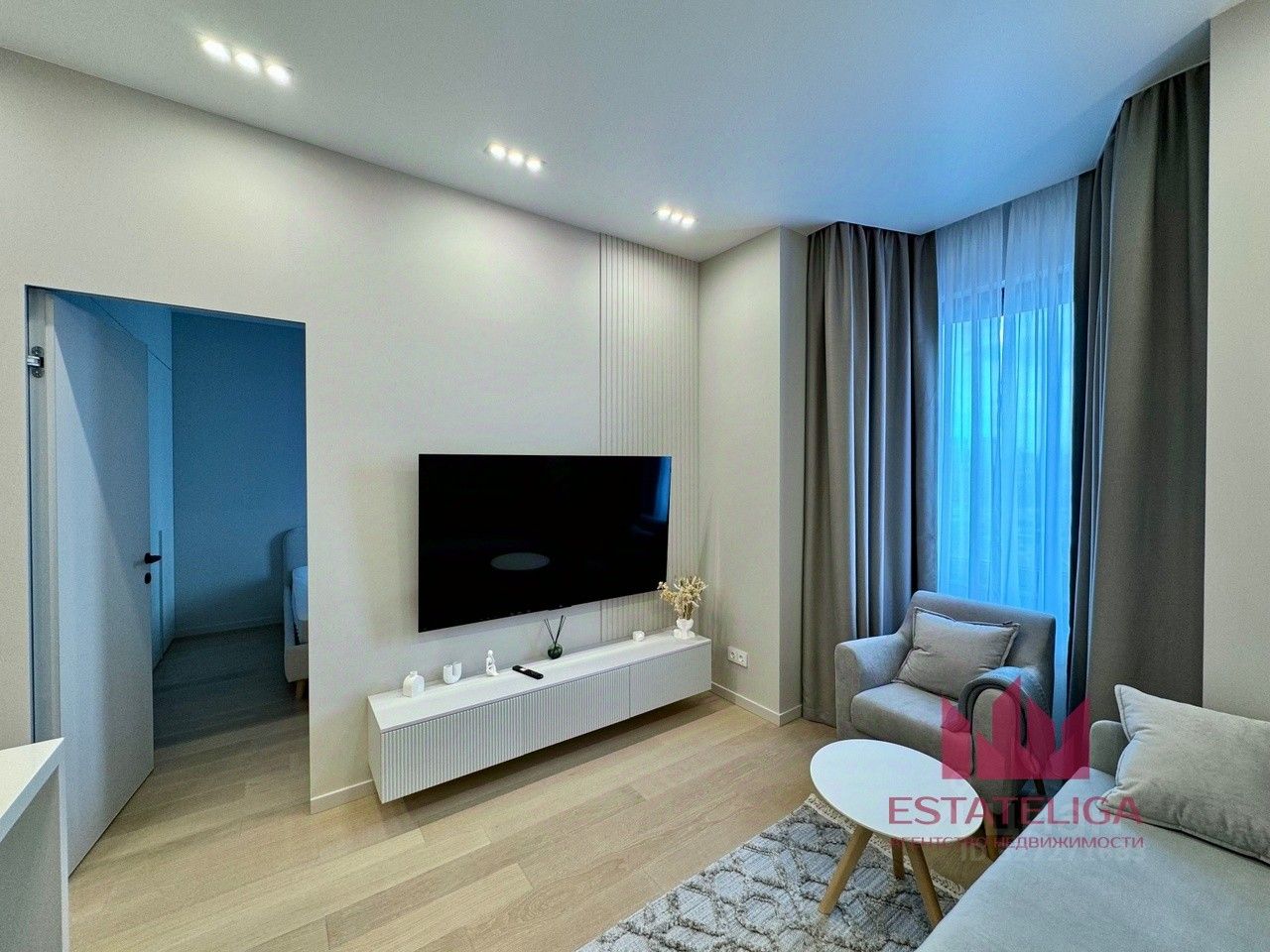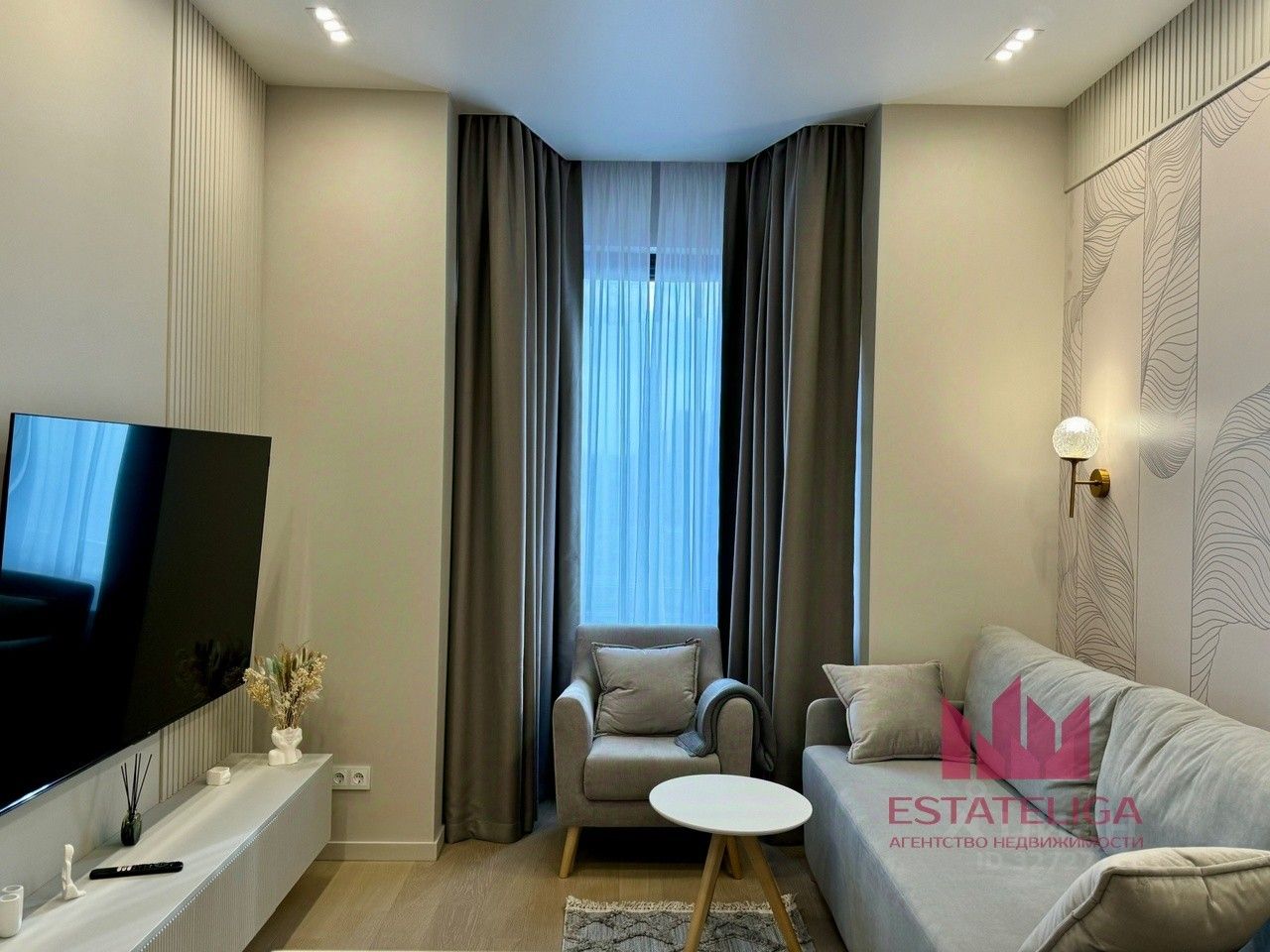 В квартире закончен дизайнерский ремонт. Планировка включает в себя изолированную спальную комнату, кухня-гостиную, ванную комнату и прихожую.