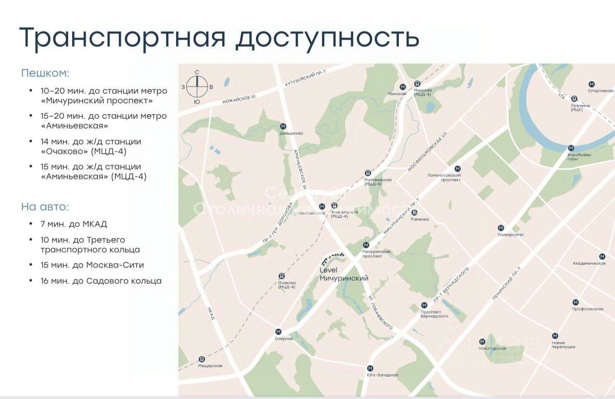 Ближайшая станция метро — Мичуринский проспект, 15 минут пешком (1,3 км). Удобный выезд на основные магистрали района Аминьевское шоссе, проспект Генерала Дорохова, Мичуринский проспект. До ТТК на машине — 10 минут. До Садового кольца на машине — 16 минут.