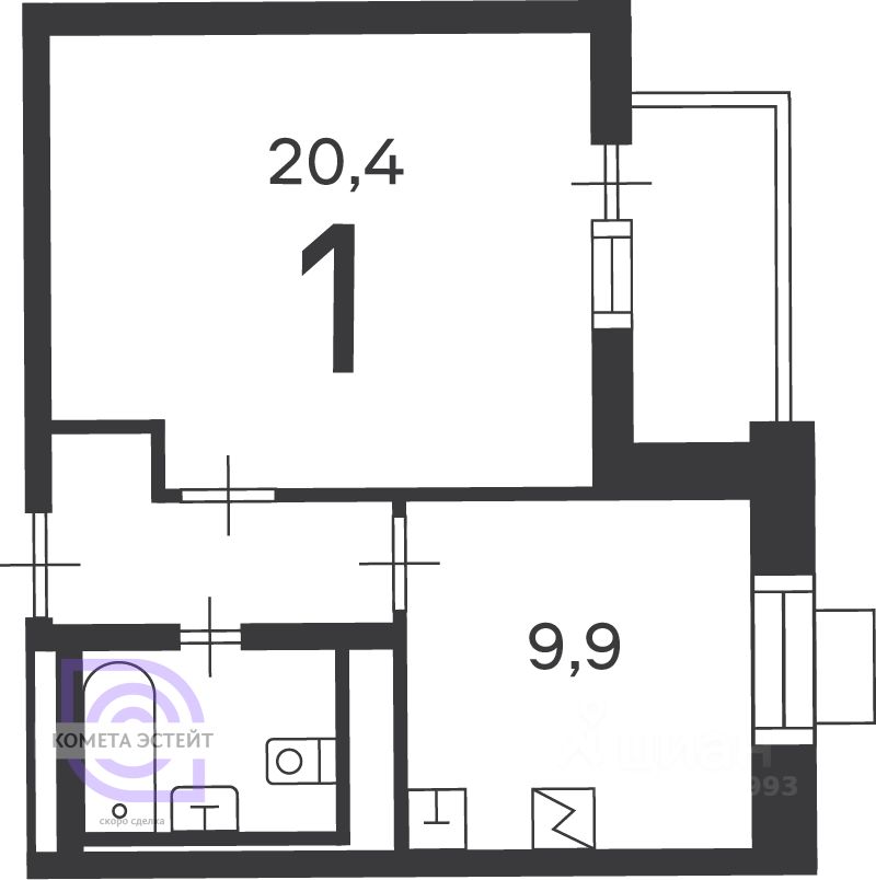 Общая площадь — 38.9 кв. м, жилая площадь — 20.4 кв. м, кухня — 9.9 кв. м.