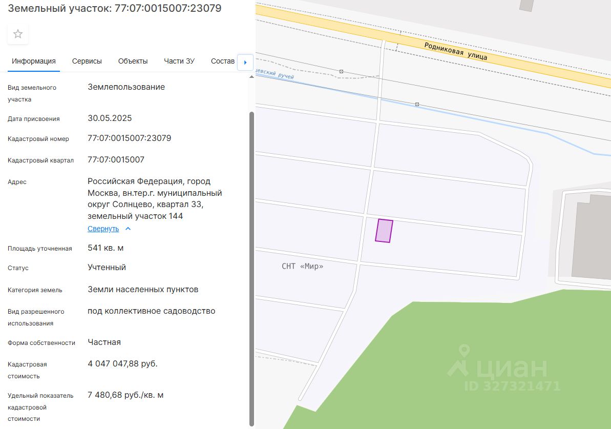 Площадь участка: 541 квадратный метр (5,4 соток). Категория земли: земли населенных пунктов. Основной вид разрешенного использования, в соответствии с ПЗЗ: Для индивидуального жилищного строительства (2.1). Кадастровый номер участка: 77:07:0015007:23079.