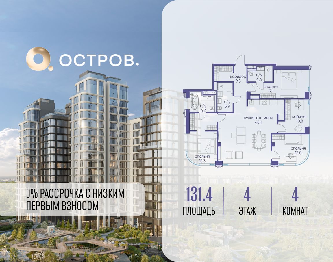 Продаётся 4-комн. квартира от застройщика: общая площадь 131.40 м², жилая 59.20 м², кухня 46.10 м², 4-й этаж, жилой квартал ''Остров 12'', корпус 1 (секция 3). Срок сдачи: 1 квартал 2029 года. 3 совмещенных санузла. В жилой зоне 2 больших окна на одну сторону, хорошая инсоляция.