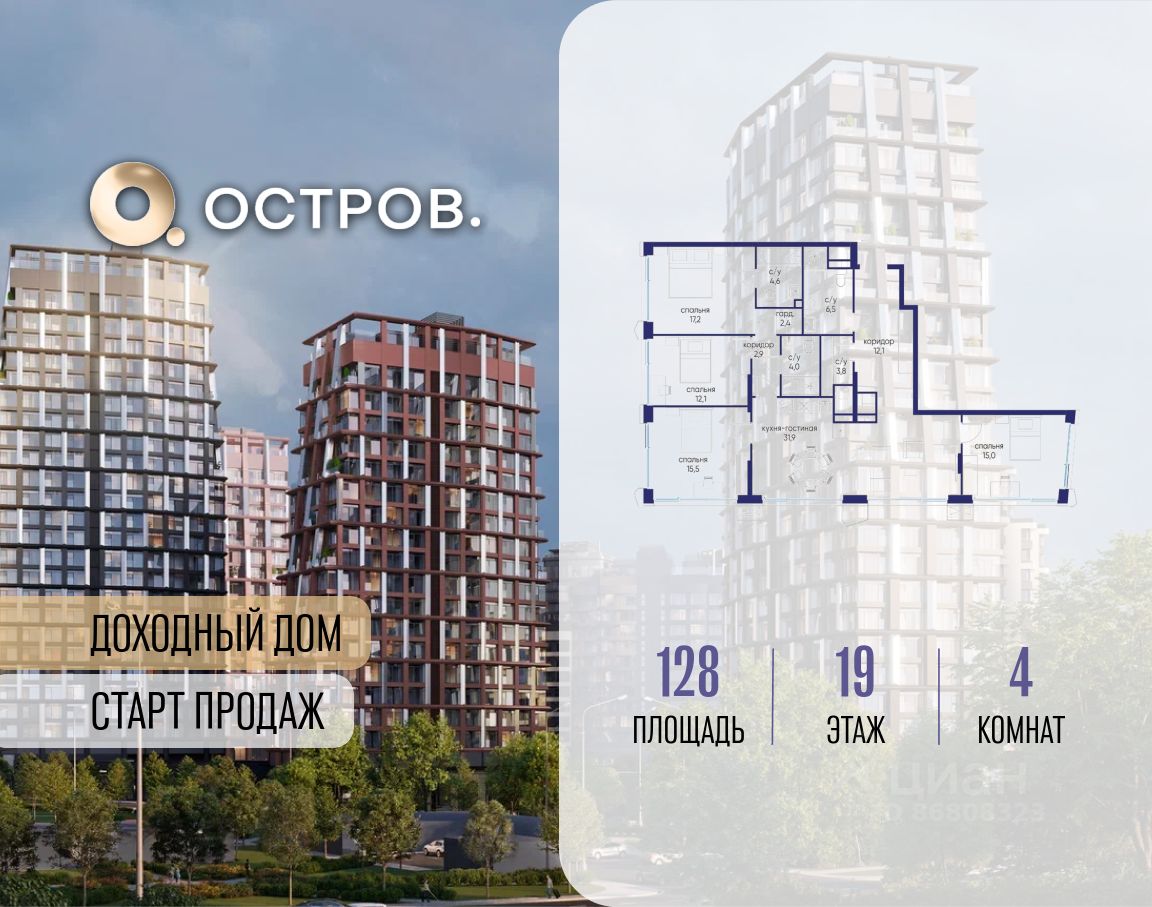 Продаётся 4-комн. квартира от застройщика: общая площадь 128.00 м², жилая 59.80 м², кухня 31.90 м², 19-й этаж, жилой квартал ''Остров 14'', корпус 6 (секция 1). Срок сдачи: 2 квартал 2029 года. 4 санузла (1 раздельный и 3 совмещенных).