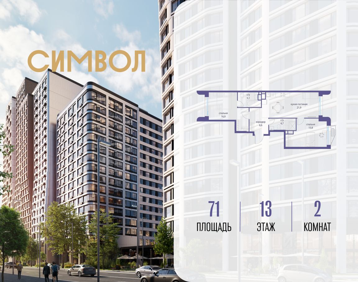 Квартал бизнес-класса СИМВОЛ - это городское пространство нового поколения в историческом районе Лефортово, на границе ЦАО, в 2 км от Садового кольца. Бионическая архитектура СИМВОЛА превратила Лефортово в суперсовременное и модное пространство. Из окон, с балконов и террас просторных квартир СИМВОЛА открываются отличные виды на город и новый парк ''Зеленая река'', ''протекающий'' через все кварталы комплекса на 2 км. В квартале уже есть все, что нужно для комфортной жизни: кафе и рестораны, супермаркеты и магазины, медицинские и физкультурно-оздоровительные центры, салоны красоты и барбершопы, аптеки и оптики, химчистки, пункты доставки и другие сервисы - всего более 90 действующих объектов внутриквартальной инфраструктуры. Для юных жителей СИМВОЛА открыты детский сад и инженерный лицей при МГТУ им. Баумана.