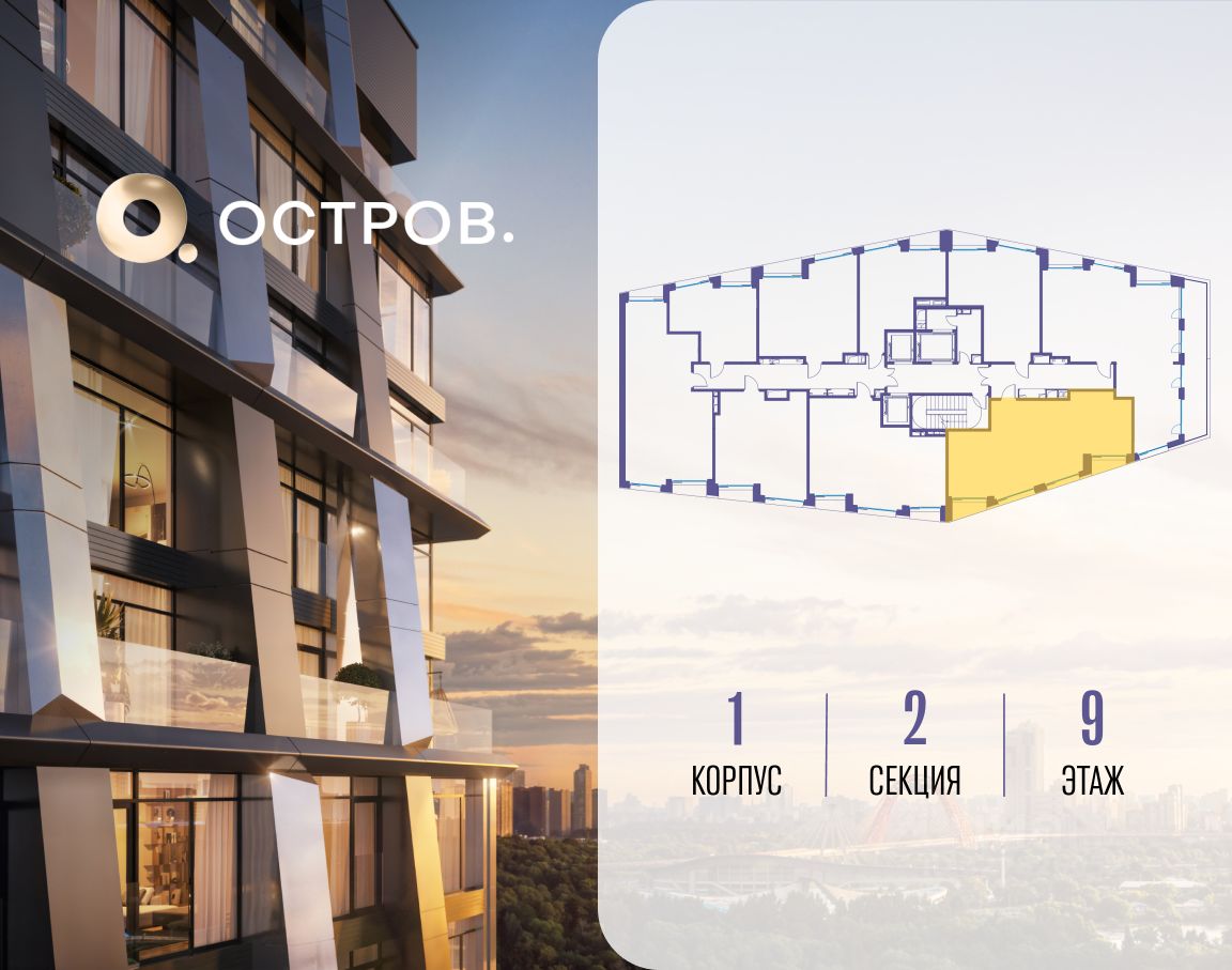 ОСТРОВ.12.1 - часть жилого комплекса на западе Москвы, в 15 минутах езды от центра. Это настоящий заповедник посреди большого города, в окружении реки и 650 га заповедников. Здесь все необходимое находится по соседству: от детского сада до супермаркета, от фитнес-зала до серфинг-центра. На территории созданы все условия для отдыха и общения: клубная инфраструктура в домах и дворы-парки, набережные и променады, маршруты для спортсменов, детей и возрастных жителей. В нескольких минутах ходьбы расположена станция метро ''Мнёвники'' БКЛ. На автомобиле - 10 минут до Москва-Сити и 15 минут до Садового кольца.